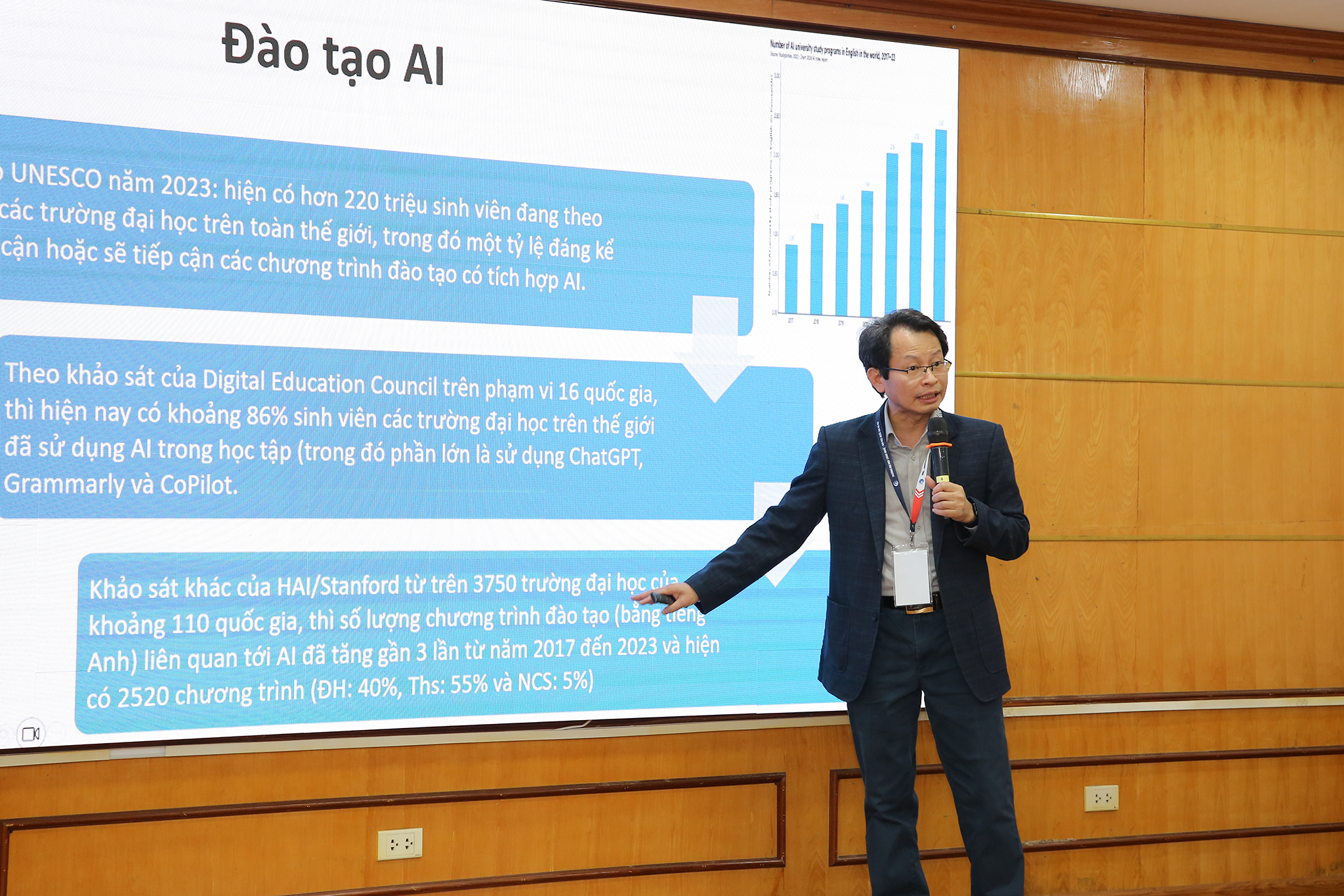 Tại hội thảo, các diễn giả đã trình bày tham luận, trao đổi, chia sẻ kinh nghiệm về vai trò của AI trong giảng dạy, nghiên cứu khoa học, quản trị đại học; đặc biệt là đào tạo AI gắn với doanh nghiệp… Cụ thể là, “Báo cáo đề dẫn về nhu cầu ứng dụng cũng như giảng dạy trí tuệ nhân tạo tại các trường đại học ở Việt Nam: thách thức và cơ hội” – PGS.TS Bùi Thu Lâm (Phó Chủ tịch, Tổng thư ký FISU Việt Nam); “Giảng dạy AI tại các trường đại học ở Việt Nam” – PGS.TS Phạm Văn Cường (Học viện Công nghệ Bưu chính – Viễn thông); “Ảnh hưởng AI trong giảng dạy” – TS Lê Đức Trọng (Trường ĐH Công nghệ, ĐHQGHN); “Ứng dụng AI trong quản trị đại học” – TS. Lương Ngọc Hoàng (Trường ĐH Công nghệ thông tin, ĐHQG TP.HCM); “Đào tạo AI gắn với doanh nghiệp” – ông Lê Hồng Việt (Tổng Giám đốc FPT Cloud); “Ứng dụng AI hỗ trợ giải đáp cho giảng viên và sinh viên về công tác đào tạo” – PGS.TS Nguyễn Hữu Quỳnh (Trường ĐH CMC). Dựa trên chiến lược giảng dạy lập trình tại Trường ĐH Công nghệ, TS Lê Đức Trọng – Khoa Công nghệ thông tin đã lần nữa khẳng định AI là xu thế của tương lai vì vậy trong giáo dục đại học cần tiếp cận cởi mở việc sinh viên sử dụng các công cụ AI hỗ trợ trong các hoạt động học tập, đặc biệt lập trình. Từ đó, mọi hoạt động giảng dạy, đảm bảo chất lượng nên lấy chuẩn đầu ra làm cơ sở định hướng việc triển khai và rà soát, điều chỉnh các chuẩn đầu ra, bổ sung các hoạt động đánh giá theo 3 nhóm chuẩn đầu ra gồm nhóm chuẩn đầu ra phải sử dụng AI, nhóm chuẩn đầu ra cấm sử dụng AI và nhóm chuẩn đầu ra tự do sử dụng AI.