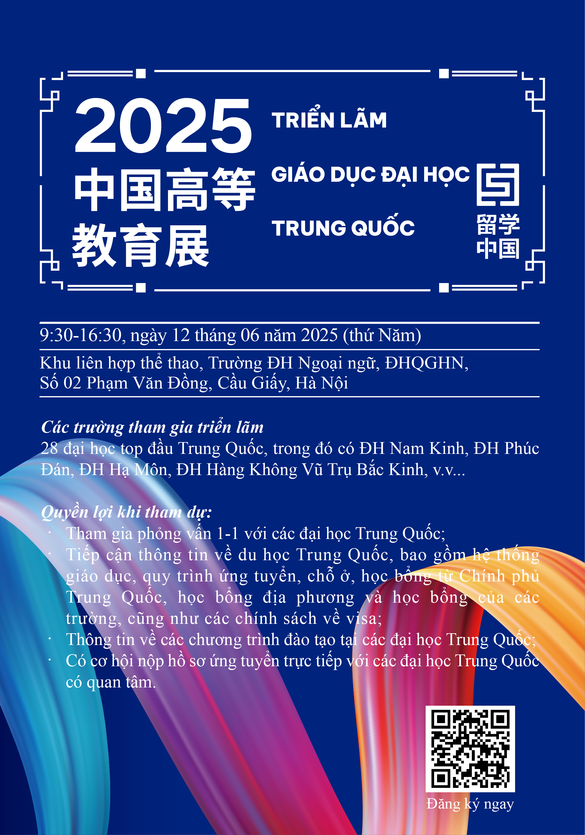 Trong khuôn khổ hợp tác giữa Đại học Quốc gia Hà Nội (ĐHQGHN) với các đối tác Trung Quốc, đồng thời nhân dịp kỷ niệm 75 năm thiết lập quan hệ ngoại giao Việt Nam – Trung Quốc và Năm Giao lưu nhân văn Việt Nam – Trung Quốc 2025, ĐHQGHN phối hợp với Ủy ban Học bổng Chính phủ Trung Quốc tổ chức Triển lãm Giáo dục Đại học Trung Quốc với sự tham dự của 28 đại học Trung Quốc.