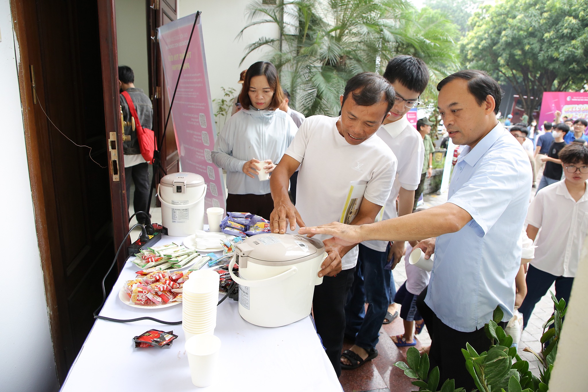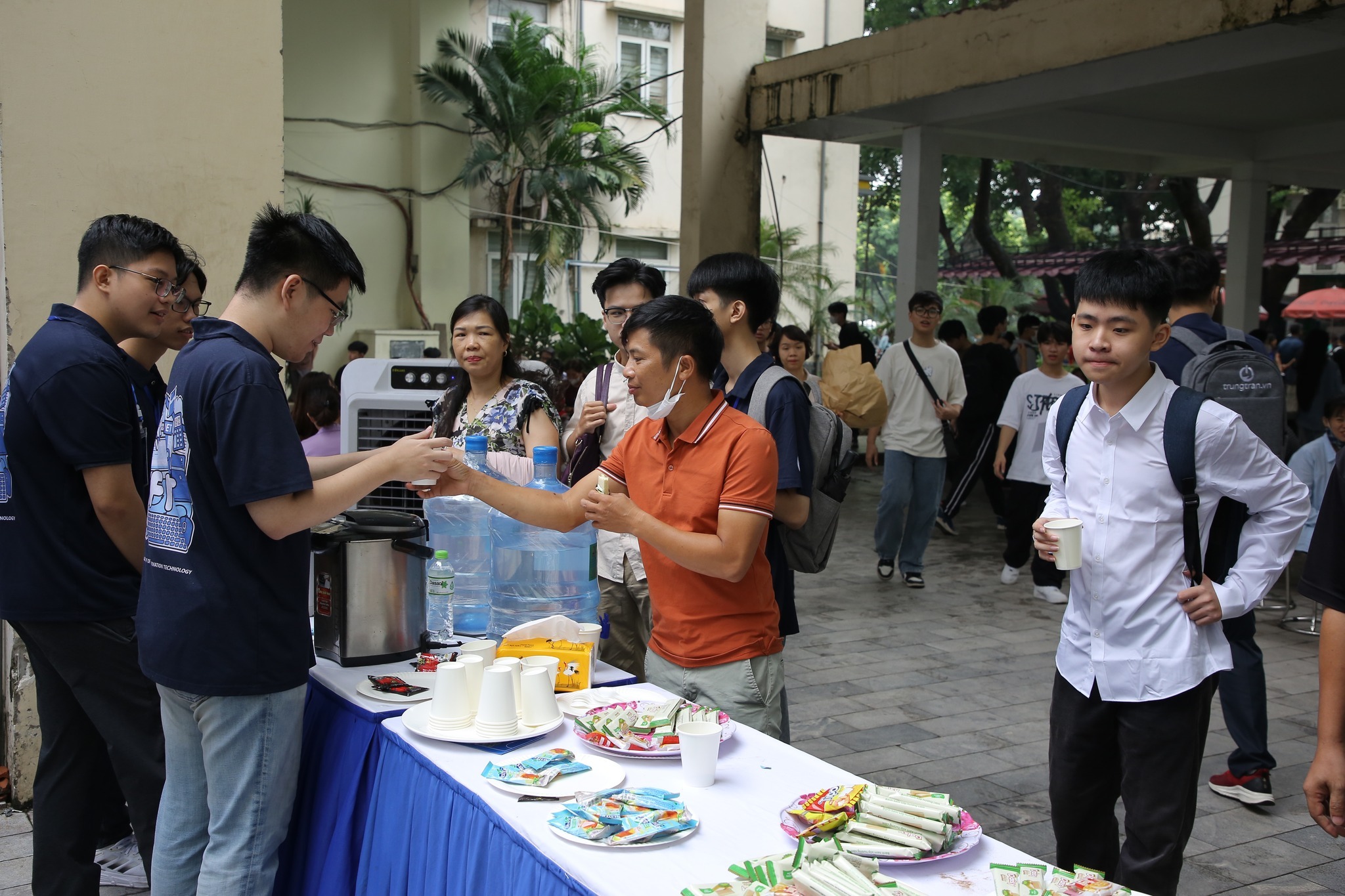 Vượt qua khoảng cách địa lý, nhiều thí sinh và phụ huynh ở các tỉnh thành xa như Hải Dương, Thái Bình, Nghệ An, Hà Tĩnh… đã không ngần ngại bắt những chuyến xe trong đêm và tờ mờ sáng để có mặt tại Trường ĐH Công nghệ tiến hành thủ tục nhập học. Tuy vất vả, nhưng với sự chuyên nghiệp, tinh giản trong quy trình nhập học nên trên khuôn mặt của phụ huynh và tân sinh viên vẫn thể hiện rõ niềm vui, sự háo hức cho chặng đường sắp tới dưới mái trường UET. Dù ngành Kỹ thuật máy tính nhập học vào buổi chiều, nhưng do ở xa và không quen đường xá ở Hà Nội nên hai bà cháu tân sinh viên Ngô Thị Cẩm Chi đã có mặt tại Trường ĐH Công nghệ từ đầu giờ sáng. Bà Nguyễn Thị Liên (Hải Dương) cho biết: “Mặc dù thời tiết khá nóng bức nhưng trong không khí nhập học đông vui, các thầy cô và các cháu sinh viên tình nguyện đều nhiệt tình hướng dẫn, hỗ trợ phụ huynh và tân sinh viên nên hai bà cháu tôi đều quên hết mệt mỏi vì đường xá xa xôi. Nhà trường còn chu đáo chuẩn bị nước, trà, cafe và đồ ăn nhẹ, giúp những gia đình đến đây từ sớm có thể nạp lại thêm một chút năng lượng để tiếp tục hành trình nhập học”. Nhớ lại giây phút Cẩm Chi thông báo về kết quả đỗ vào Trường ĐH Công nghệ, bà Nguyễn Thị Liên chia sẻ: “Tôi vẫn còn nhớ như in niềm hạnh phúc khi cháu gái thông báo kết quả trúng tuyển vào Trường, cả hai bà cháu đều vui mừng và cả đêm không ngủ được”. Với hoàn cảnh gia đình khó khăn, bà Nguyễn Thị Liên đã chăm sóc và nuôi nấng Cẩm Chi từ những ngày còn bé, bà hiểu rẳng chỉ có con đường học tập mới giúp cháu gái có một tương lai tươi sáng: “Tôi mong cháu cố gắng nỗ lực học tập và tôi tin tưởng với chất lượng đào tạo, đội ngũ giảng viên chất lượng cao sẽ giúp cháu hoàn thành ước mơ với những kỹ năng phát triển tương lai”.