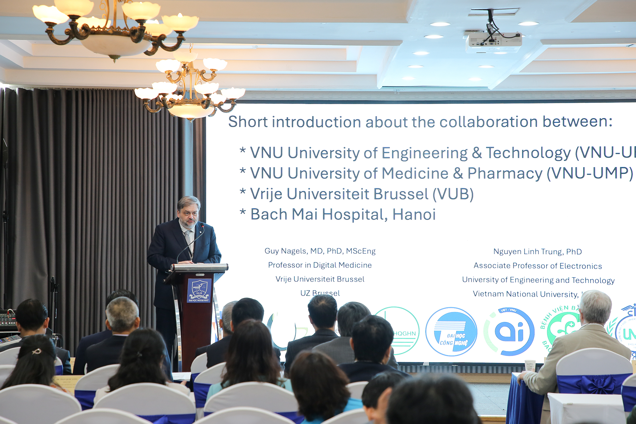 Tại hội thảo, GS.TS Guy Nagels – ĐH Vrije Universiteit Brussel đã trình bày tóm tắt những hợp tác nghiên cứu 4 bên giữa Trường ĐH Công nghệ, Trường ĐH Y Dược (ĐHQGHN), Bệnh viện Bạch Mai và ĐH Vrije Universiteit Brussel. Trong đó, từ năm 2023 đến nay, Trường ĐH Công nghệ và VUB đã có những hợp tác liên quan đến đào tạo, đồng tổ chức hội thảo “Thoái hóa thần kinh và trí tuệ nhân tạo” và tổ chức các bài giảng về Khoa học thần kinh tính toán. Với những hợp tác trong đào tạo và nghiên cứu giữa các bên, GS.TS Guy Nagels nhấn mạnh, việc ký kết giữa 4 bên trong lĩnh vực y học số là điều tất yếu không những mang lại những lợi thế trong lĩnh vực y học số, đồng thời góp phần tăng cường mối quan hệ hợp tác giữa Việt Nam và Bỉ.