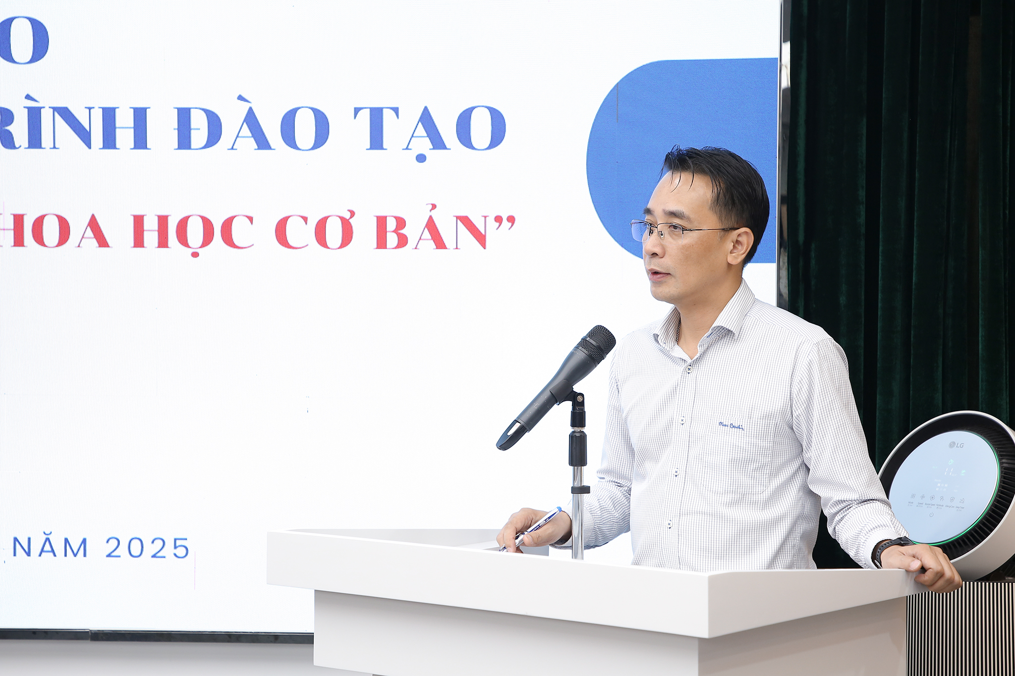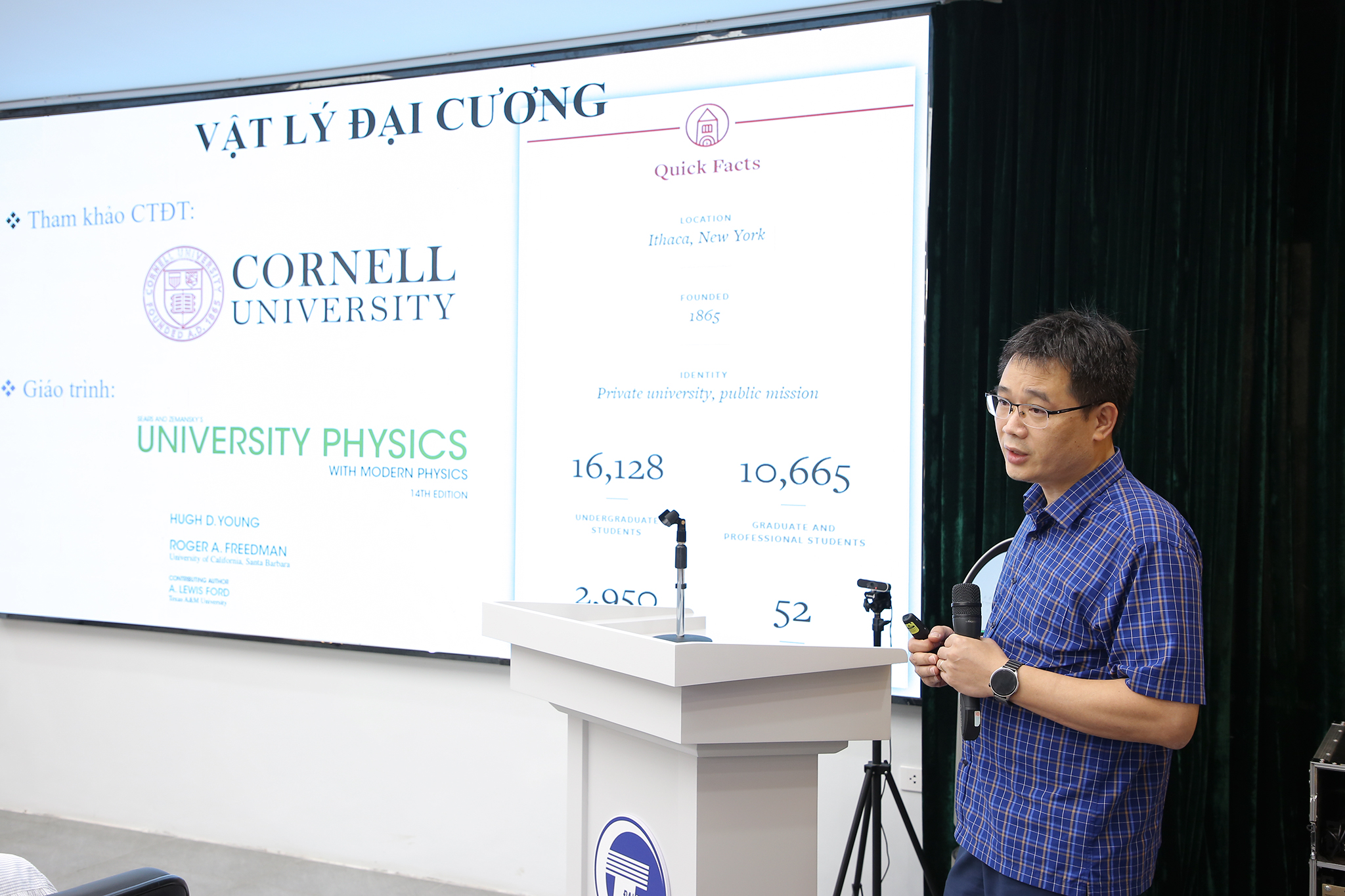 Sau phần khai mạc, đại diện các tổ công tác đã lần lượt trình bày các báo cáo chương trình đào tạo các học phần Toán và Khoa học cơ bản. PGS. TS. Nguyễn Đình Lãm (Khoa Vật lý kỹ thuật và Công nghệ nano) đã trình bày báo cáo “Học phần Vật lý đại cương” với sự thay đổi nội dung môn Vật lý đảm bảo đạt chuẩn quốc tế. Dựa trên tham khảo Đại học Cornell (Hoa Kỳ), nội dung bám sát giáo trình University Physics và đối sánh chương trình giáo dục phổ thông môn Vật lý, học phần sẽ cung cấp các kiến thức Vật lý cơ bản về cơ học, nhiệt học, điện – từ và quang học; hình thành tư duy khoa học và kỹ năng giải quyết vấn đề; làm nền tảng cho các học phần chuyên ngành kỹ thuật và khoa học tự nhiên.