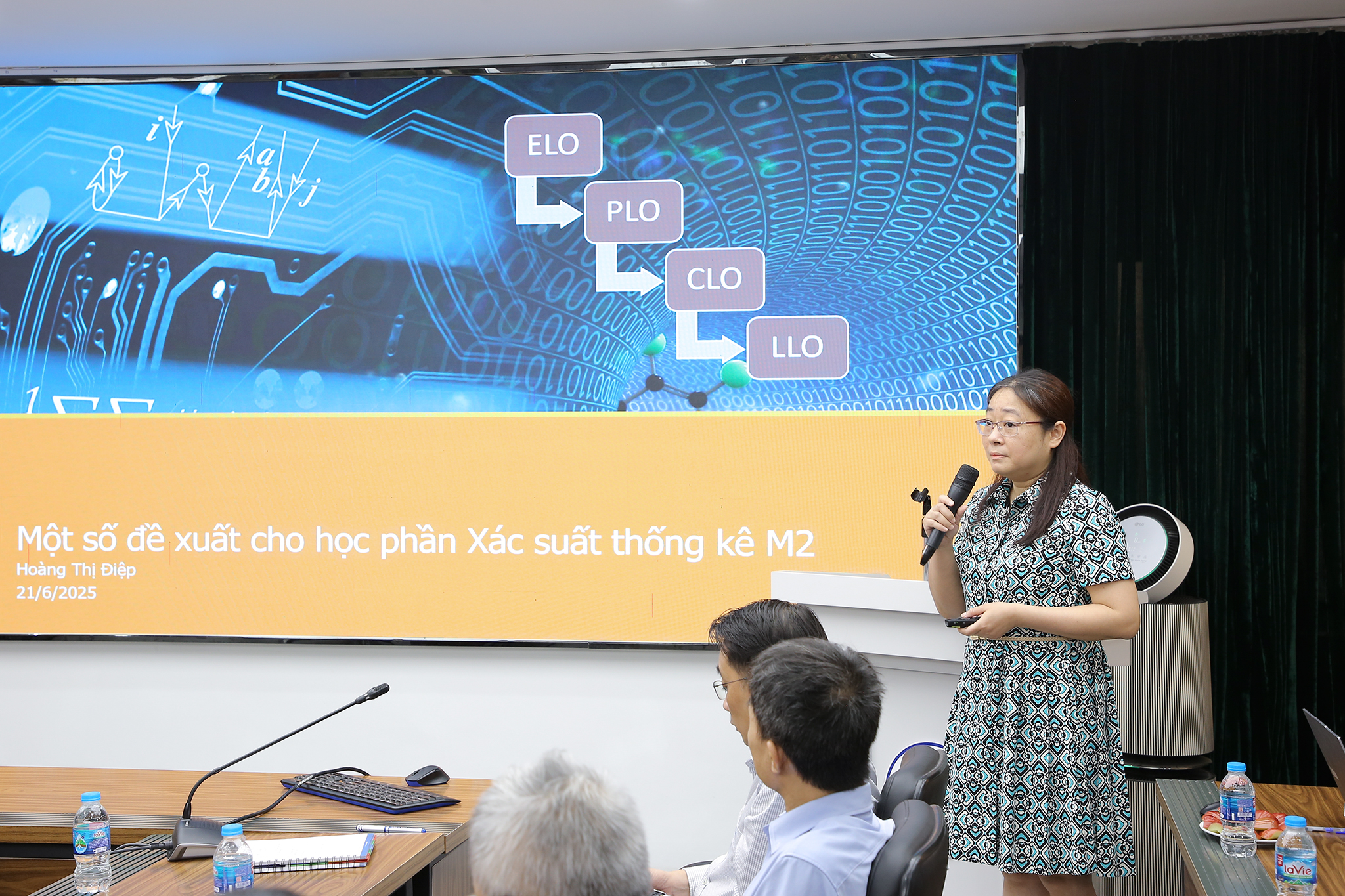 TS. Hoàng Thị Điệp (Khoa Công nghệ thông tin) trình bày báo cáo “Một số đề xuất cho học phần Xác suất thống kê M2” với nhiều thay đổi về mục tiêu, nội dung giảng dạy. Dựa trên các giáo trình quốc tế, mục tiêu của chương trình đào tạo sẽ mở rộng, nhấn mạnh việc vận dụng kiến thức xác suất thống kê trong phân tích, xử lý dữ liệu thực tế kèm theo thành thạo công cụ lập trình, phát triển tư duy logic và năng lực giải quyết vấn đề thực tiễn trong nhiều lĩnh vực. Từ đó, nội dung giảng dạy sẽ có thêm nhiều chủ đề bổ sung, cụ thể là phân tích nhân quả, thí nghiệm ngẫu nhiên và các kỹ thuật sử dụng biến bổ sung…