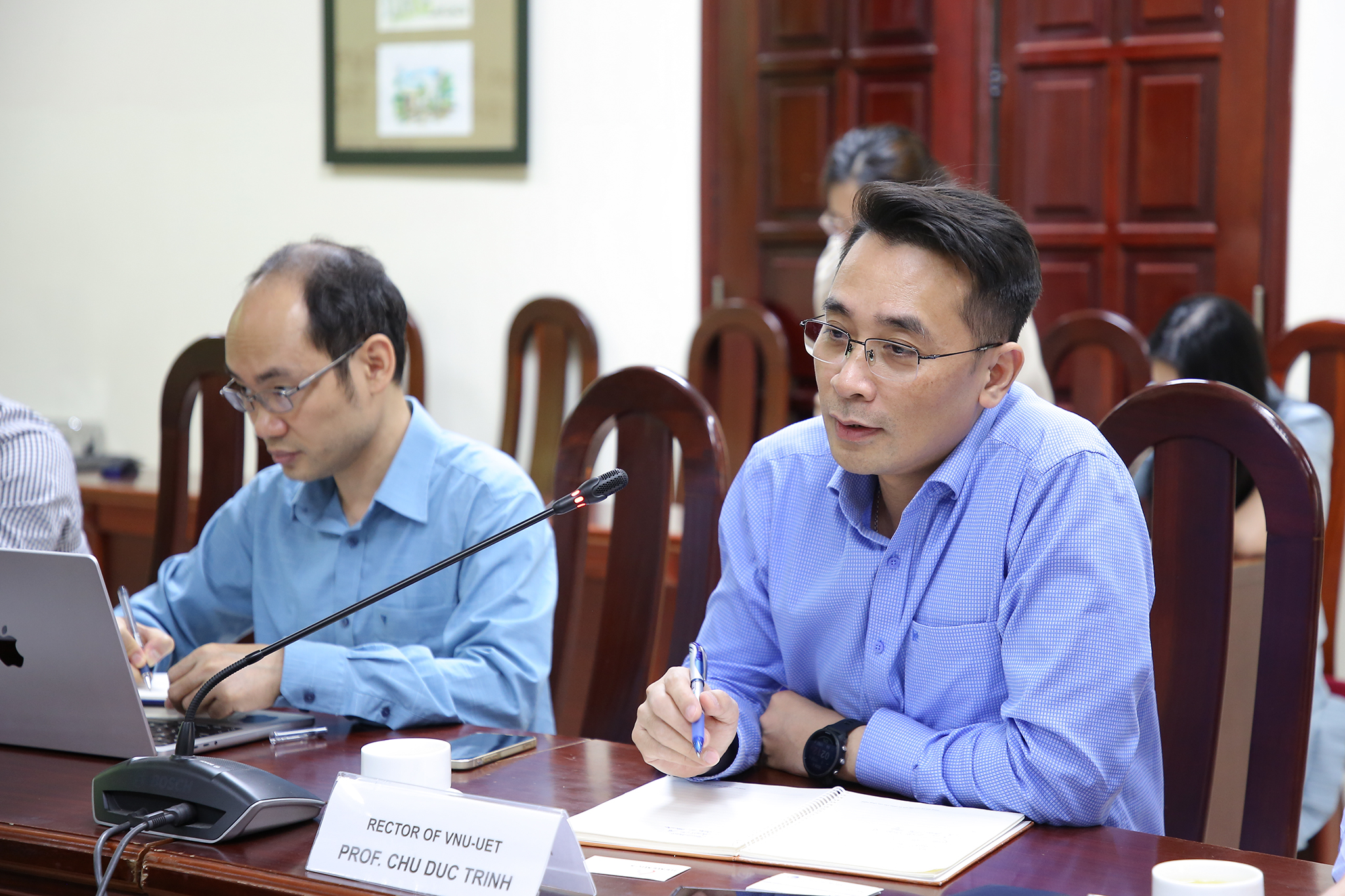 Tham dự buổi tiếp đoàn về phía ĐHQGHN có PGS.TS Lê Tuấn Anh – Trưởng ban Hợp tác phát triển. Về phía Trường ĐH Công nghệ có GS.TS Chử Đức Trình – Hiệu trưởng, PGS.TS. Nguyễn Hoài Sơn – Trưởng phòng KHCN&HTPT, lãnh đạo khoa Điện tử Viễn thông, Phòng thí nghiệm trọng điểm Công nghệ Micro&Nano.