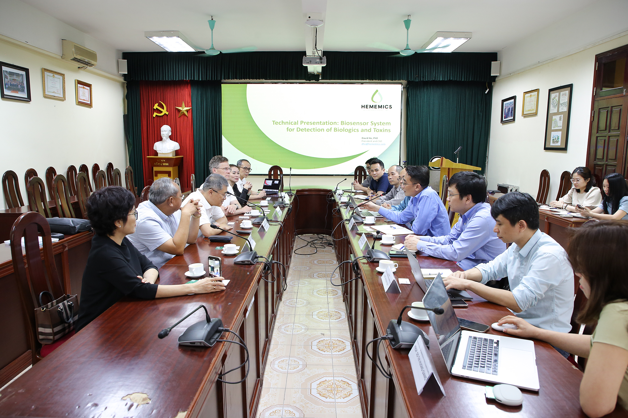 Trên tinh thần cởi mở hợp tác, ông David Huy Hồ – Chủ tịch/ Người sáng lập Công ty đã vui mừng và đề xuất hợp tác với Trường. Công ty Hememics Biotechnologies là công ty nghiên cứu thiết kế và chế tạo cảm biến sinh học, nắm giữ nhiều bằng độc quyền sáng chế tại Mỹ. Theo đó, ông David Huy Hồ đã giới thiệu công nghệ của Công ty và mong muốn được mang những công nghệ trong lĩnh vực vi mạch, bán dẫn về Việt Nam. Qua buổi gặp mặt, phía công ty mong muốn hợp tác với Nhà trường trong đào tạo nhân lực, nghiên cứu phát triển các cảm biến sinh học góp phần phát triển hệ sinh thái bán dẫn.