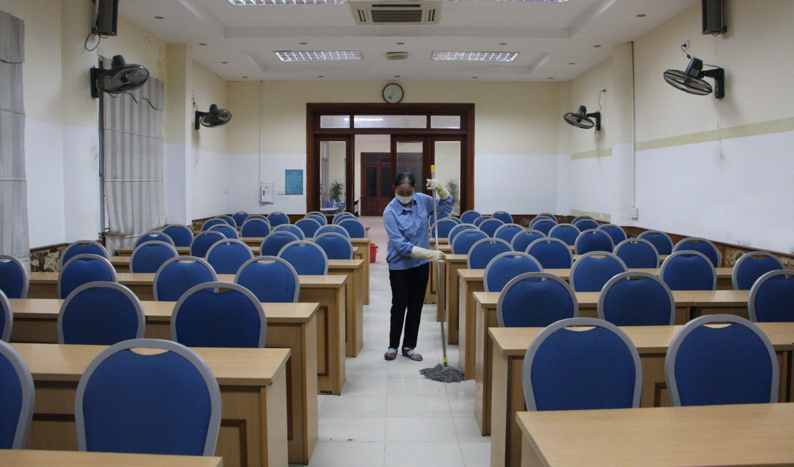 Nhà trường đã thực hiện công tác vệ sinh, phun khử trùng, khử khuẩn tại các phòng học, giảng đường, phòng thực hành và làm sạch bàn ghế sẽ tiếp tục được thực hiện từ hôm nay. Nhằm chuẩn bị tốt cơ sở vật chất để đảm bảo an toàn cao nhất cho tình huống sinh viên đi học trở lại.
