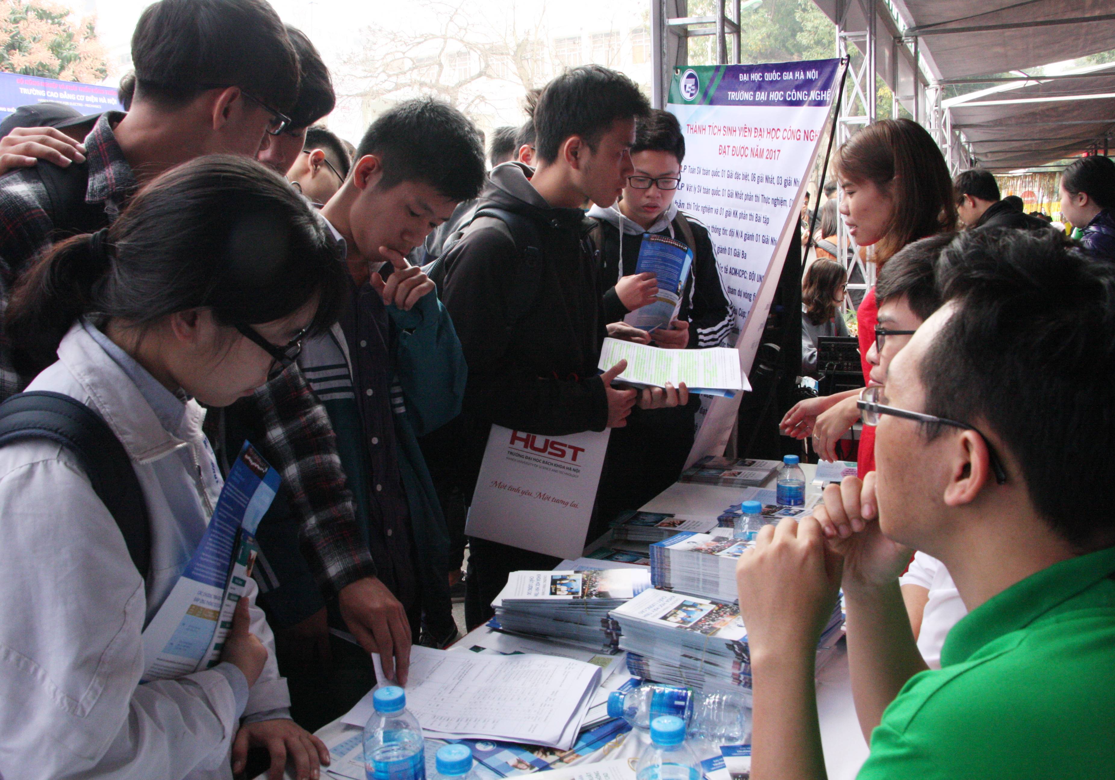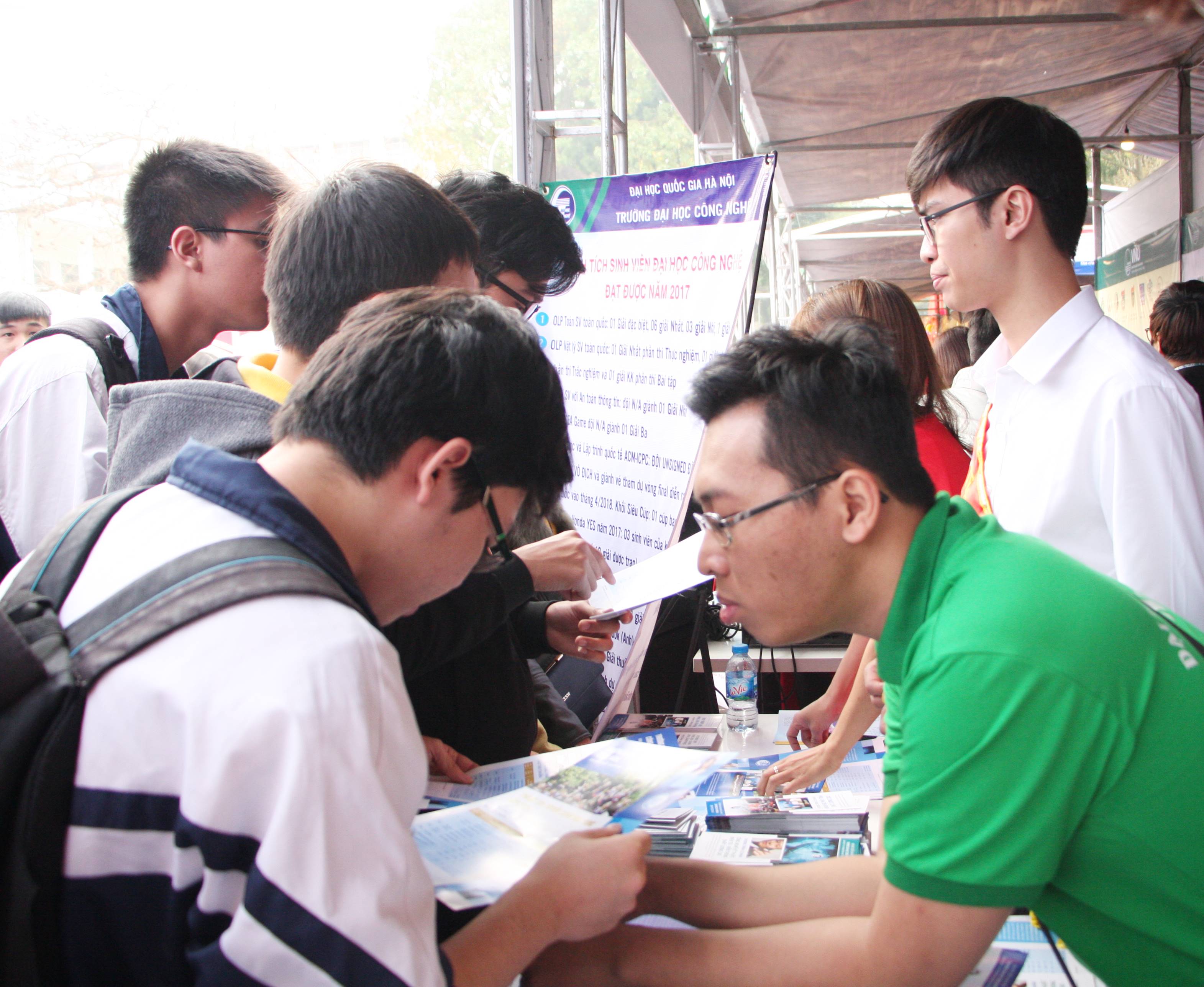 Tại gian tư vấn của Trường ĐH Công Nghệ, các cán bộ và sinh viên tình nguyện của Nhà trường đã tiếp đón, tư vấn và giải đáp các thắc mắc của nhiều phụ huynh và các em học sinh quan tâm tới kỳ thi tuyển sinh đại học chính quy năm 2018 cũng như giới thiệu trực tiếp tới từng học sinh về Nhà trường,lĩnh vực khoa học công nghệ và cụ thể tới từng ngành đào tạo hiện nay của Nhà trường. Những vấn đề được đông đảo các em học sinh quan tâm trao đổi nhiều nhất, đó là tổ hợp môn thi mà Trường Đại hoc Công nghệ sử dụng để xét tuyển năm 2018 và cơ hội nghề nghiệp của các em sau khi tốt nghiệp.