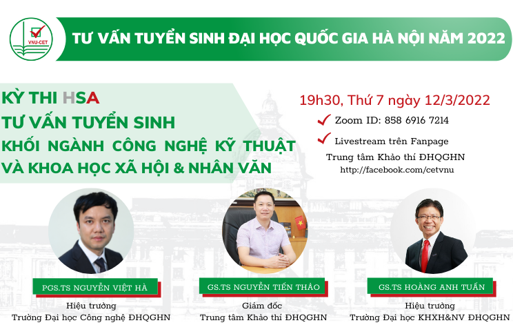 Ngày 12/3 tới đây, Trung tâm Khảo thí ĐHQGHN phối hợp với Trường ĐH Công nghệ và Trường ĐH Khoa học Xã hội & Nhân văn tổ chức tư vấn trực tuyến với chủ đề “Kỳ thi HAS và tư vấn tuyển sinh khối ngành Công nghệ kỹ thuật và Khoa học Xã hội & Nhân văn”.