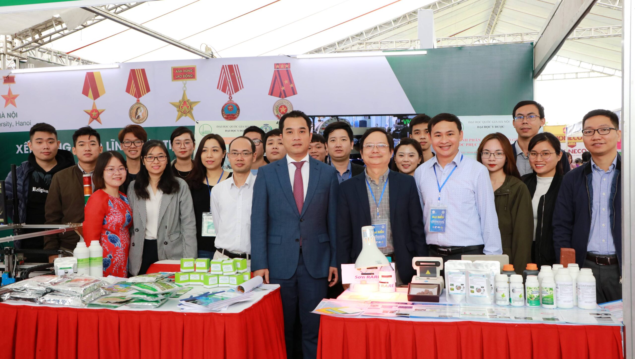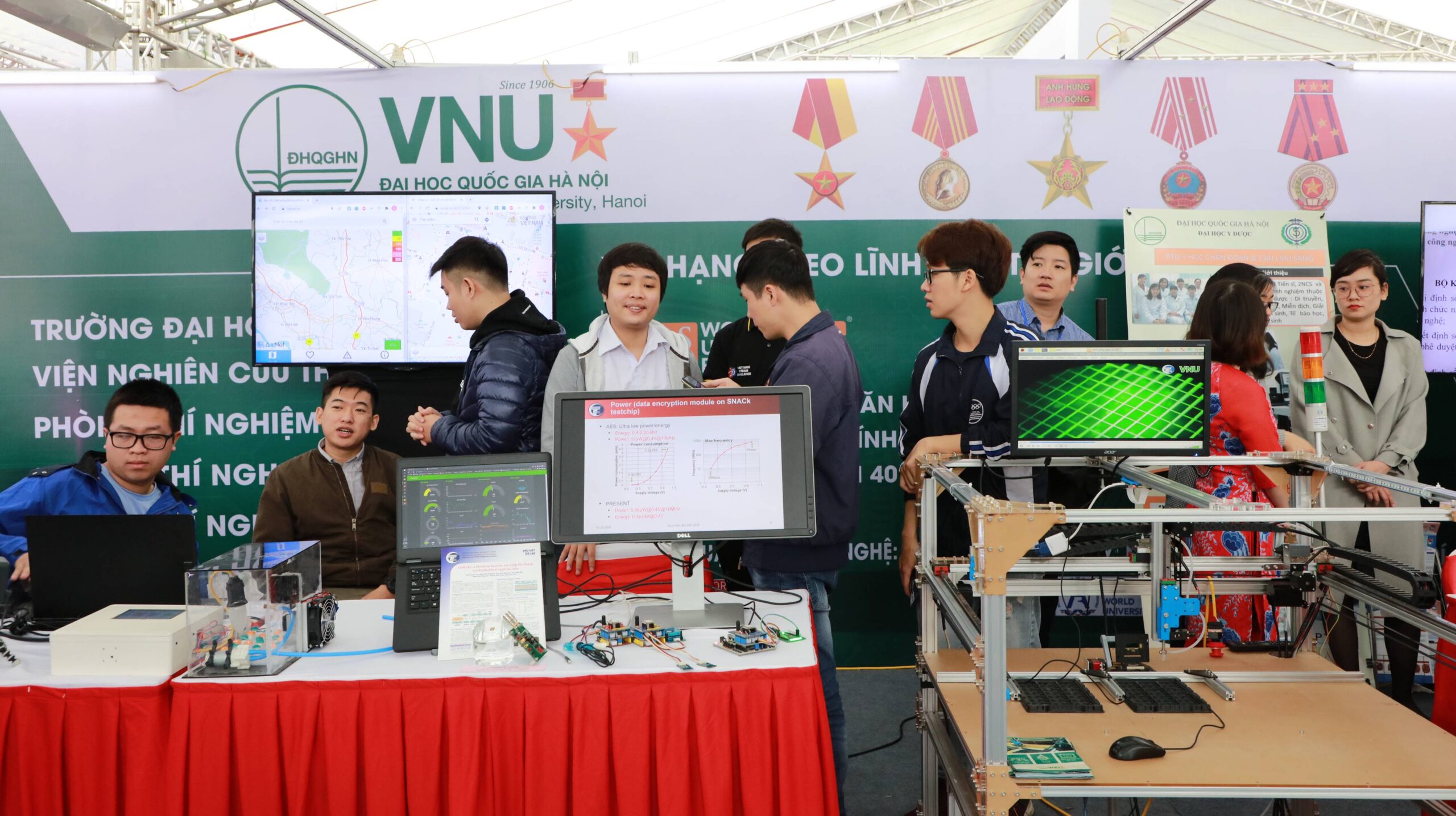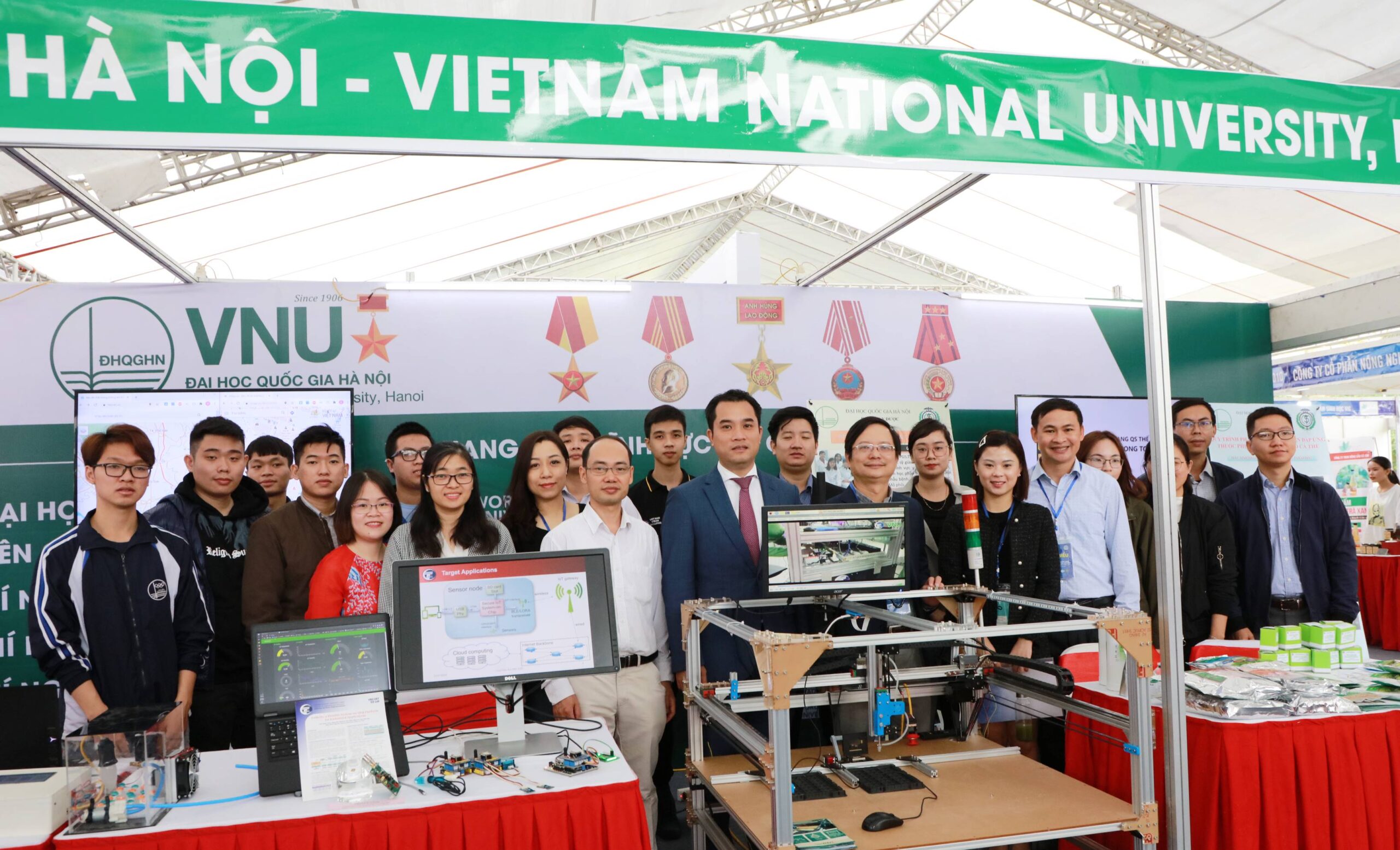 Mang đến triển lãm gần 40 sản phẩm khoa học công nghệ, 3 gian hàng của ĐHQGHN đã thu hút sự quan tâm đặc biệt của khách tham quan. Trong đó, Trường ĐHCN tham gia trưng bày 09 sản phẩm. Các sản phẩm bao gồm: chip IoT công suất thấp với tính năng bảo mật dùng cho các hệ thống giám sát môi trường; hệ thống tưới tiêu tự động cho nông trại quy mô lớn; nền tảng IoT cho nhà thông minh; bản đồ số Việt Nam http://vmap.vn; mạng lưới AirNet giám sát bụi mịn trong không khí (https://airnet.vn); thiết bị giám sát và điều khiển trồng Nấm công nghệ cao, quy mô Công nghiệp; hệ thống LED chiếu sáng và các hệ thống giám sát thông số trong nông nghiệp ứng dụng công nghệ IoT; hệ thống tự động hóa công đoạn kiểm tra linh kiện trong dây truyền sản xuất tự động; hệ thống thực tại ảo trong nghệ thuật dân tộc Việt Nam.