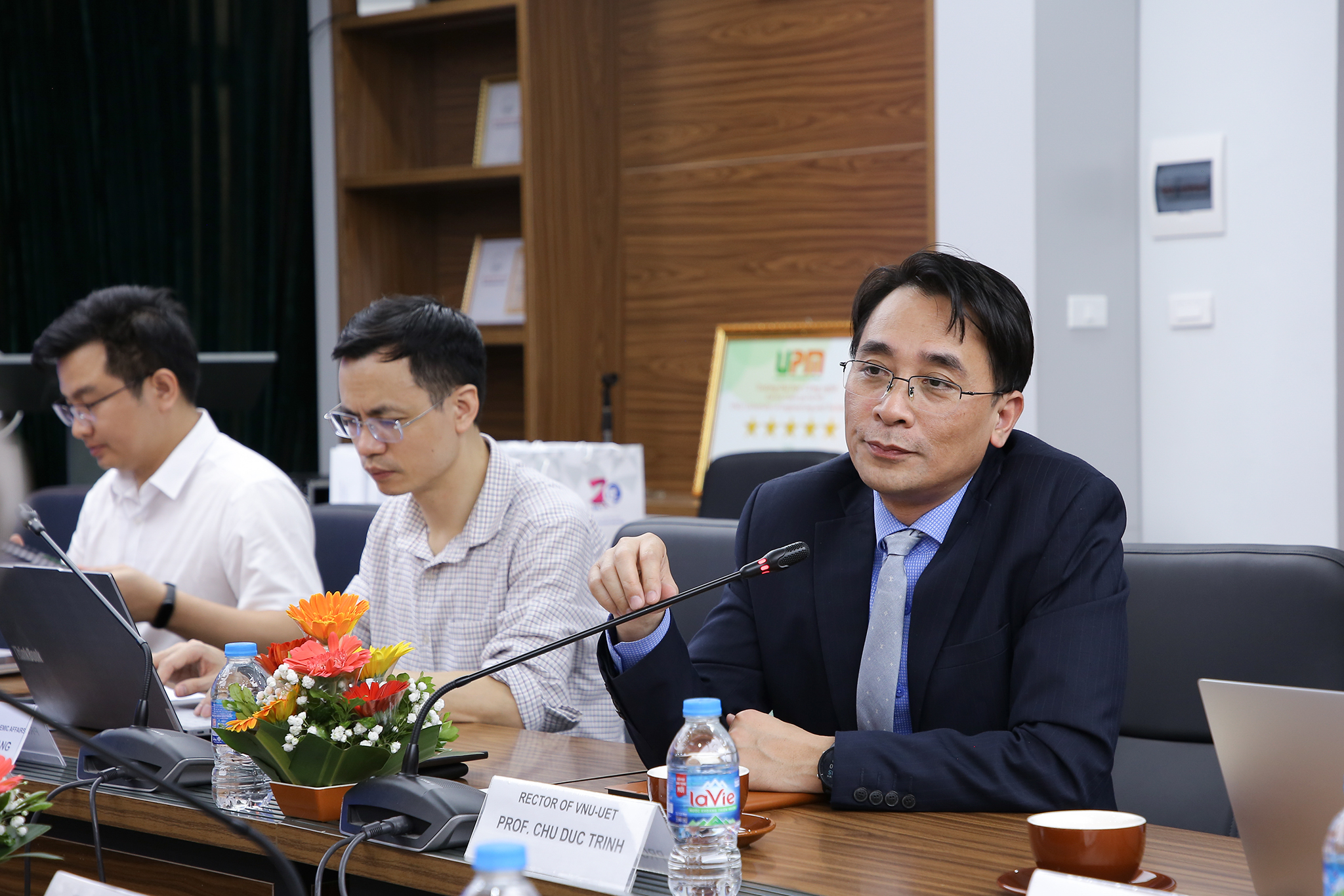 Trong khuôn khổ buổi làm việc, GS.TS Chử Đức Trình nhấn mạnh thế mạnh của Trường ĐH Công nghệ trong hợp tác đào tạo, nghiên cứu khoa học với các doanh nghiệp, tập đoàn lớn trong nước và quốc tế, đặc biệt trong các lĩnh vực bán dẫn, trí tuệ nhân tạo. Hiệu trưởng cũng chia sẻ về đề án “Đổi mới, nâng cao chất lượng đào tạo sau đại học”. Theo đó, học viên cao học và nghiên cứu sinh được miễn học phí, hưởng sinh hoạt phí hàng tháng, đối với học viên là 5 triệu đồng/tháng và nghiên cứu sinh 7 triệu đồng/tháng. Bên cạnh quyền lợi, học viên cao học và nghiên cứu sinh có trách nhiệm học tập, nghiên cứu toàn thời gian tại Trường, đảm bảo tiến độ theo kế hoạch, tích cực tham gia các đề tài nghiên cứu khoa học, các khóa đào tạo nâng cao năng lực giảng dạy và nghiên cứu. Hiệu trưởng cũng bày tỏ mong muốn mở rộng hợp tác đào tạo với VUB trong thời gian tới.