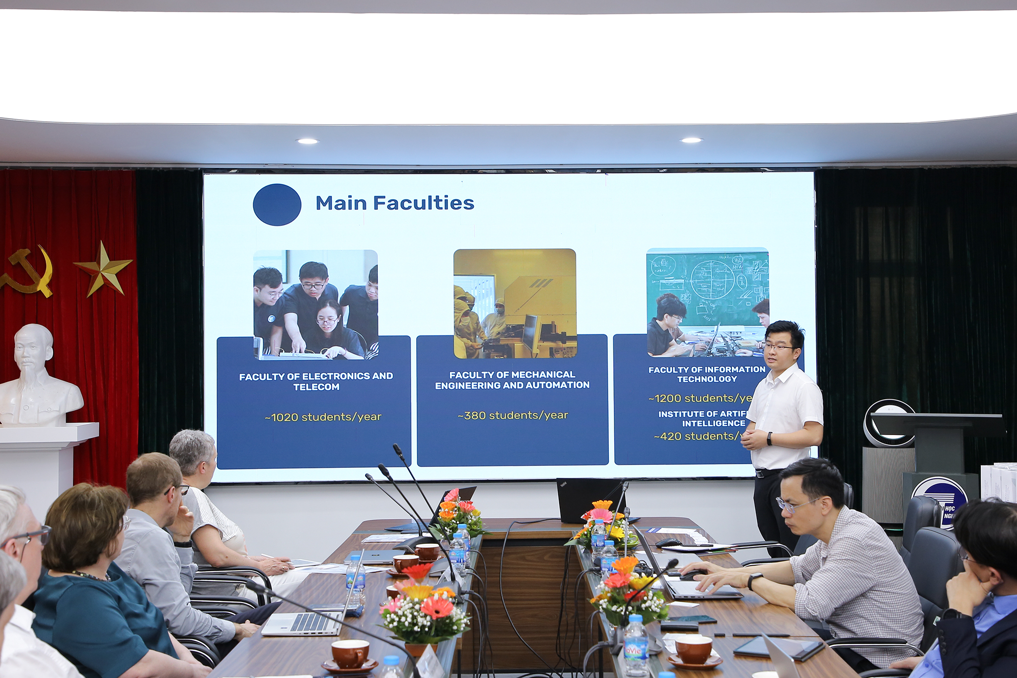 Cuộc gặp do GS.TS Chử Đức Trình – Hiệu trưởng chủ trì, cùng sự tham gia của lãnh đạo các đơn vị Phòng KHCN&HTPT, Phòng Đào tạo, Khoa Công nghệ thông tin, Khoa Điện tử viễn thông và Viện Trí tuệ nhân tạo.