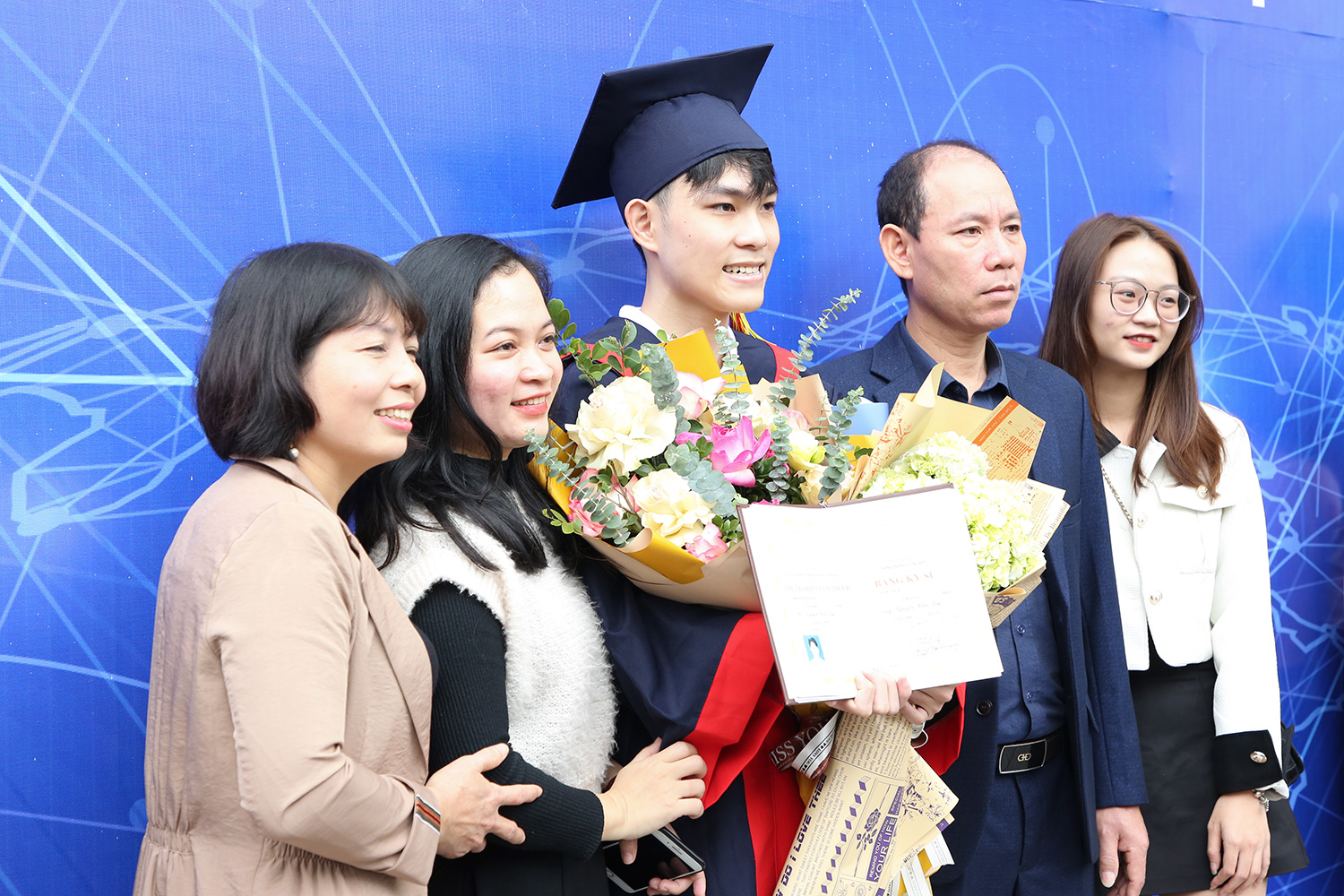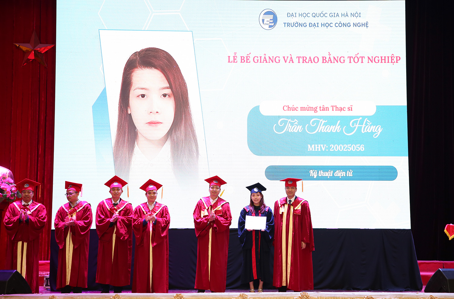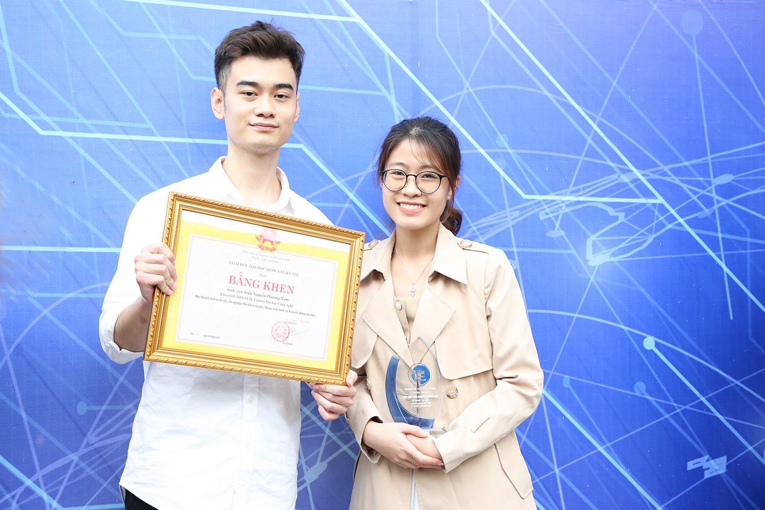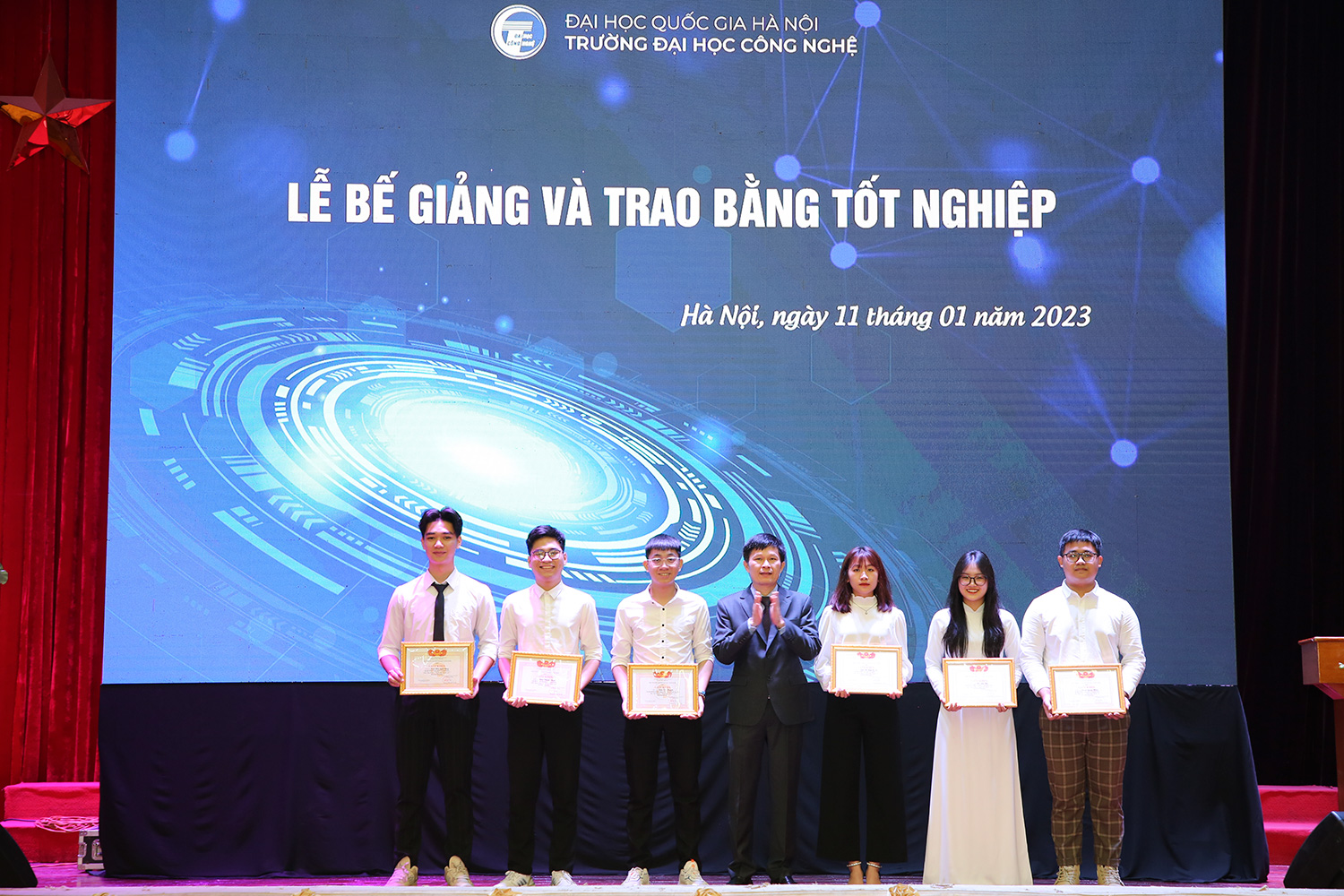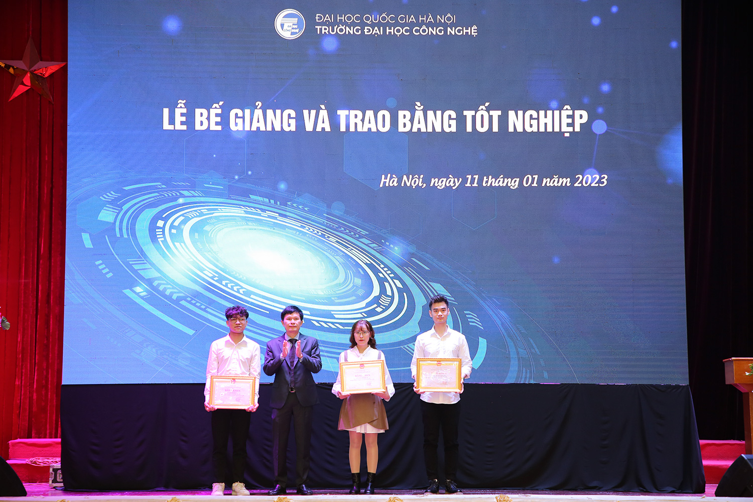 Phó Hiệu trưởng Nguyễn Anh Thái trao Bằng khen của Giám đốc ĐHQGHN cho các tân cử nhân là thủ khoa đầu ra gồm Trần Nguyễn Phương Nam (ngành Mạng máy tính và Truyền thông dữ liệu), đồng thủ khoa ngành Công nghệ kỹ thuật xây dựng là Cao Thị Phương Anh và Trịnh Đức Đô