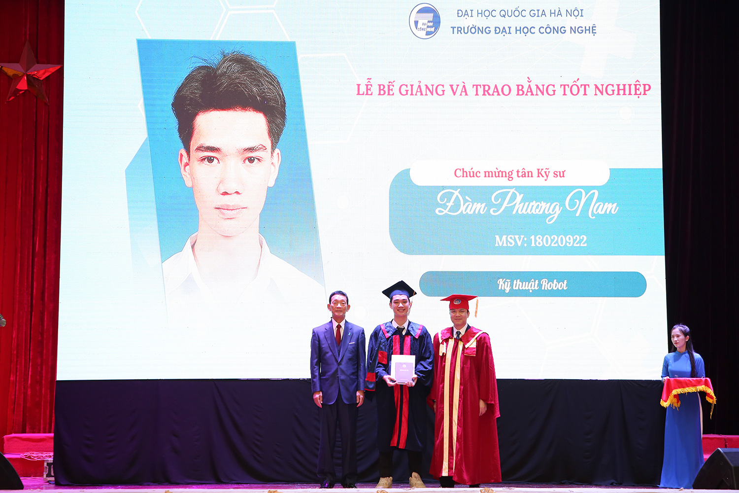 Với thành tích nghiên cứu và học tập xuất sắc, tân kỹ sư khóa I ngành Kỹ thuật robot Đàm Phương Nam (khoa Điện tử viễn thông) chia sẻ về cảm nhận vui mừng và tự hào tại thời khắc quan trọng nhất trong 4,5 năm học tập nghiên cứu tại Trường. Từ những ngày đầu tiên bước chân vào giảng đường với buổi lễ khai giảng đầu tiên của thời sinh viên, trải qua 4,5 năm học tập và nghiên cứu, tân kỹ sư Đàm Phương Nam cũng như nhiều sinh viên ngành Kỹ thuật robot đã trưởng thành, hoàn thiện về chuyên môn và nhận thức. “Đến thời điểm này, lễ trao bằng là thời khắc quan trọng đánh dấu việc kết thúc quá trình nỗ lực học tập ở đại học của chúng em để nhận tấm bằng của khóa tân kỹ sư đầu tiên ngành Kỹ thuật robot Trường ĐH Công nghệ. Trong những năm tháng học tập, em đã có những trải nghiệm cùng sự đồng hành của các giáo sư, giảng viên đến từ ĐH Chiba và sự tận tụy, dẫn dắt của các thầy cô Trường ĐH Công nghệ. Những buổi học với GS Ken làm em ấn tượng về những công nghệ, kiến thức trong lĩnh vực robotics. Cùng những chuyến tham quan, nghiên cứu tại ĐH Chiba, Nhật Bản làm em ấn tượng về môi trường quốc tế, công nghệ kỹ thuật tiên tiến. Tất cả những kỷ niệm này sẽ trở thành động lực và hành trang nghề nghiệp giúp em tự tin nuôi dưỡng đam mê để thành công trong sự nghiệp tương lai”.