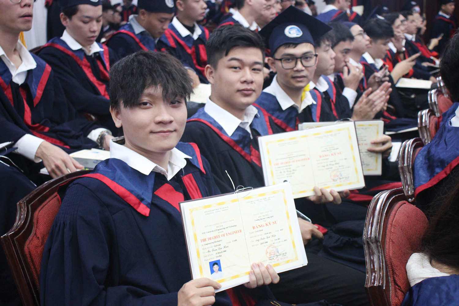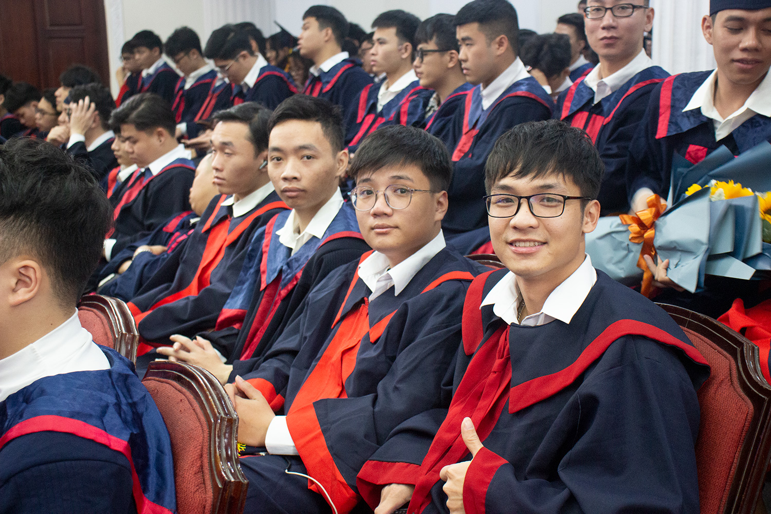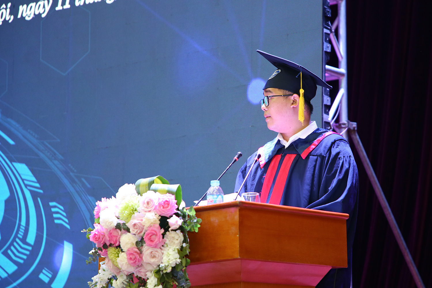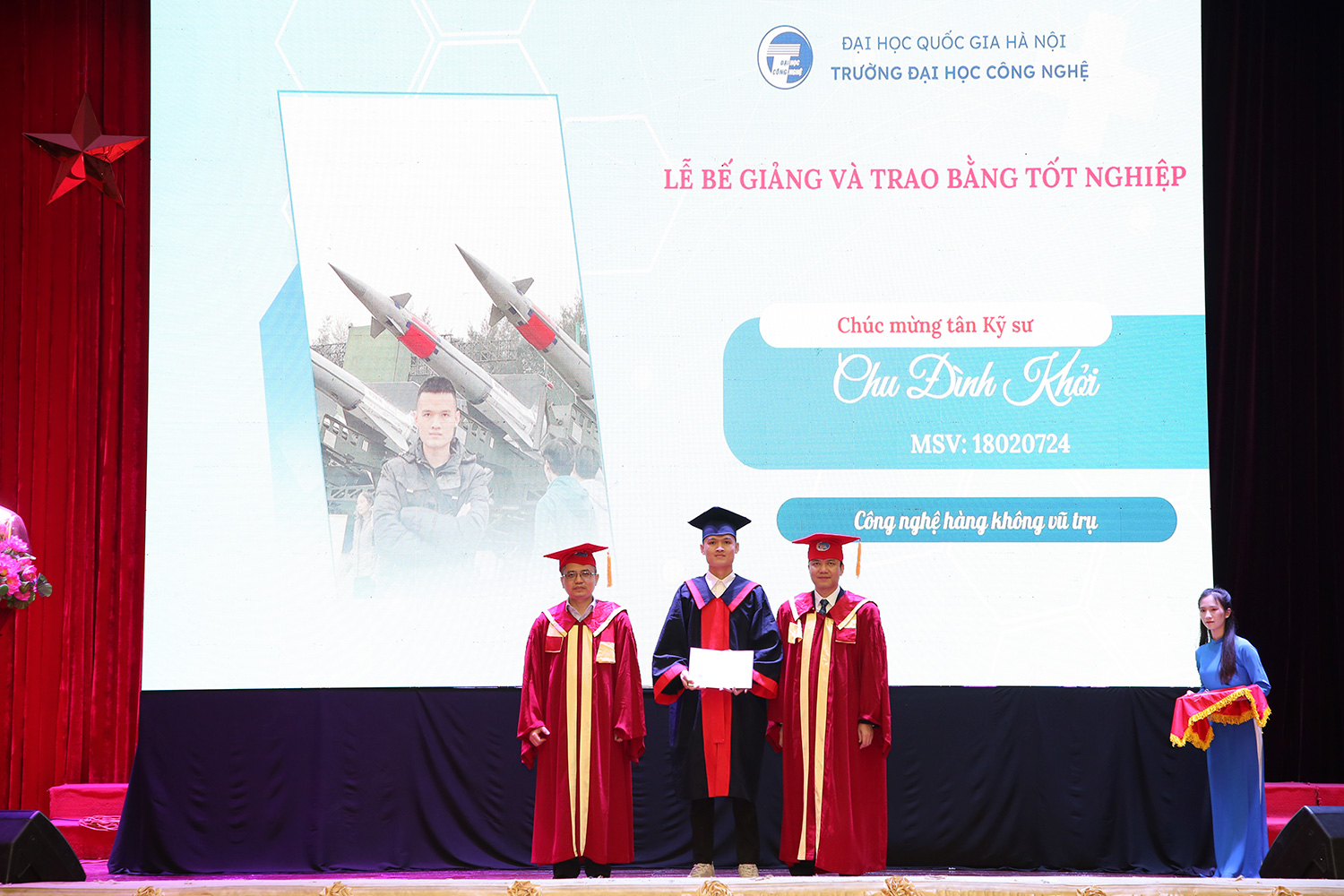 Thay mặt các tân tiến sĩ, tân thạc sĩ, tân kỹ sư và cử nhân, phát biểu tại buổi lễ tân kỹ sư Phạm Quang Hùng ngành Kỹ thuật Robot chia sẻ về những ngày đầu tiên lựa chọn ngành Kỹ thuật Robot là điểm đến của mình sau kì thi Đại học năm 2018. Quang Hùng chỉ biết đây là ngành mới và khoá K63 là thế hệ sinh viên Robotics đầu tiên của Trường. Nhưng sau 4,5 năm học tập, đối với Hùng và những tân kỹ sư thì đây chính là ngôi nhà thứ 2, có thầy cô là cha mẹ, bạn bè là những người anh em và chính nơi này đã giúp em nuôi dưỡng ước mơ và hơn nữa là phát triển hoài bão của bản thân. Robotic là một ngành hoàn toàn mới, điều đó vừa là cơ hội vừa là thử thách đối với sinh viên. “Tuy nhiên, đồng hành cùng chúng em luôn là thầy cô và Nhà trường, đặc biệt là Khoa Điện tử viễn thông đã luôn nỗ lực hoàn thiện chương trình giảng dạy để có thể truyền đạt kiến thức cho chúng em một cách hiệu quả nhất. Ngoài ra, chúng em cũng may mắn khi có sự hỗ trợ từ các giáo sư đầu ngành của ĐH Chiba với những bài giảng truyền cảm hứng, trang bị thêm hành trang kiến thức quan trọng. Tất cả những điều đó đều giúp chúng em định hướng con đường tương lai phù hợp với khả năng của từng người” – Quang Hùng nhấn mạnh.