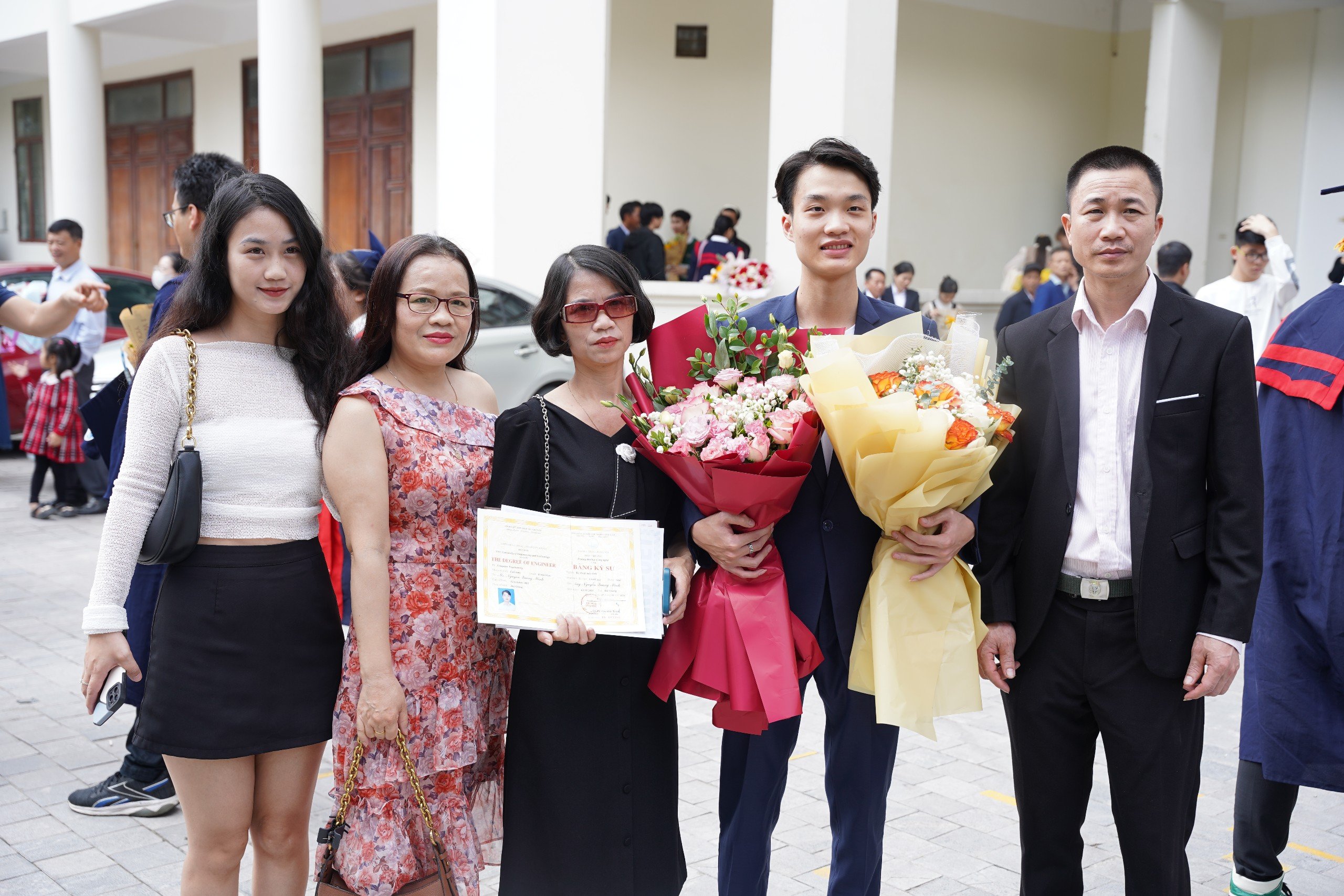 Niềm tự hào, hãnh diện và hạnh phúc không chỉ thể hiện trên ánh mắt và nụ cười của những tân Tiến sĩ, Thạc sĩ, Kỹ sư, Cử nhân, mà còn nhận thấy trên gương mặt của những người thân đến tham dự. Gia đình chị Nguyễn Thị Xuân Lương – phụ huynh của tân cử nhân Bùi Hoàng Nam (ngành Hệ thống thông tin) đã xuất phát từ Quảng Ninh lên Hà Nội từ sớm để cùng chia sẻ niềm vui với Nam trong ngày lễ trọng đại này “Theo con từ những ngày đầu nhập học với sự hướng dẫn nhiệt tình của các thầy cô, các cháu sinh viên tình nguyện là tôi đã ấn tượng và hoàn toàn tin tưởng khi gửi gắm cháu trong môi trường giáo dục của Trường ĐH Công nghệ. 4 năm đồng hành cùng con, dù ở xa nhưng gia đình luôn nhận được thông tin về thành tích học tập của Nam. Điều đó làm tôi cảm thấy yên tâm khi con được học tập và phát triển bản thân trong môi trường đào tạo với các thầy cô giáo nhiệt tình, tâm huyết. Đến nay khi thấy cháu cầm tấm bằng cử nhân là gia đình biết niềm tin đã được đền đáp xứng đáng và Trường ĐH Công nghệ là lựa chọn đúng đắn cho quá trình trưởng thành, phát triển của Nam”.