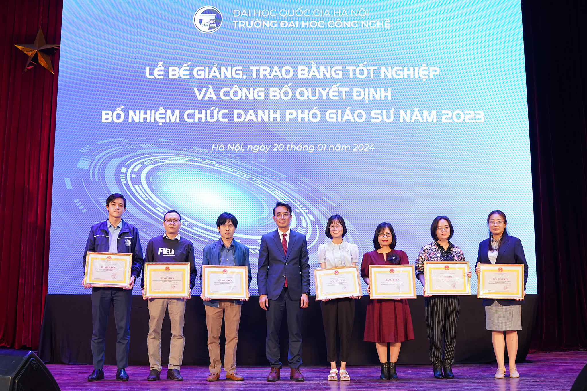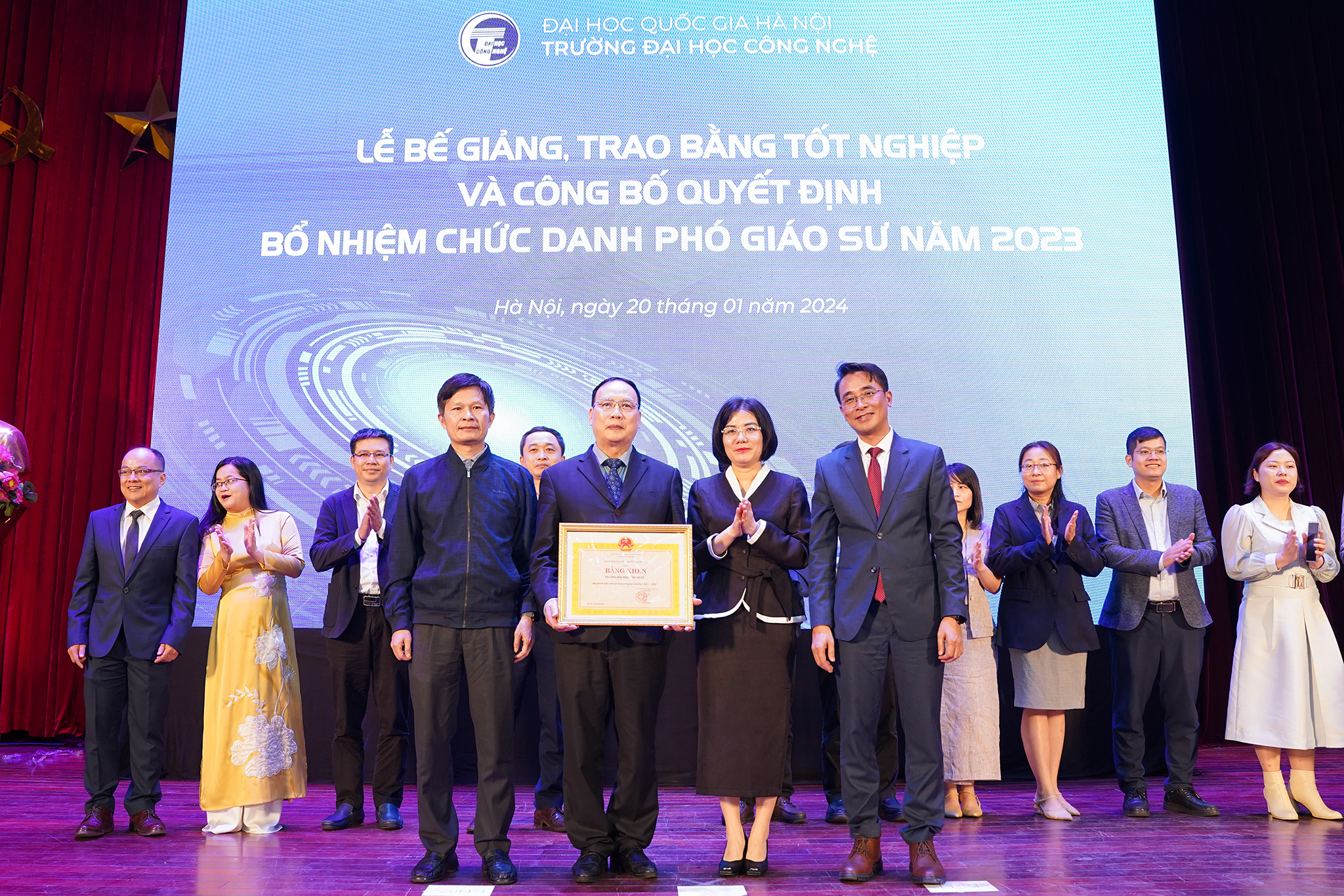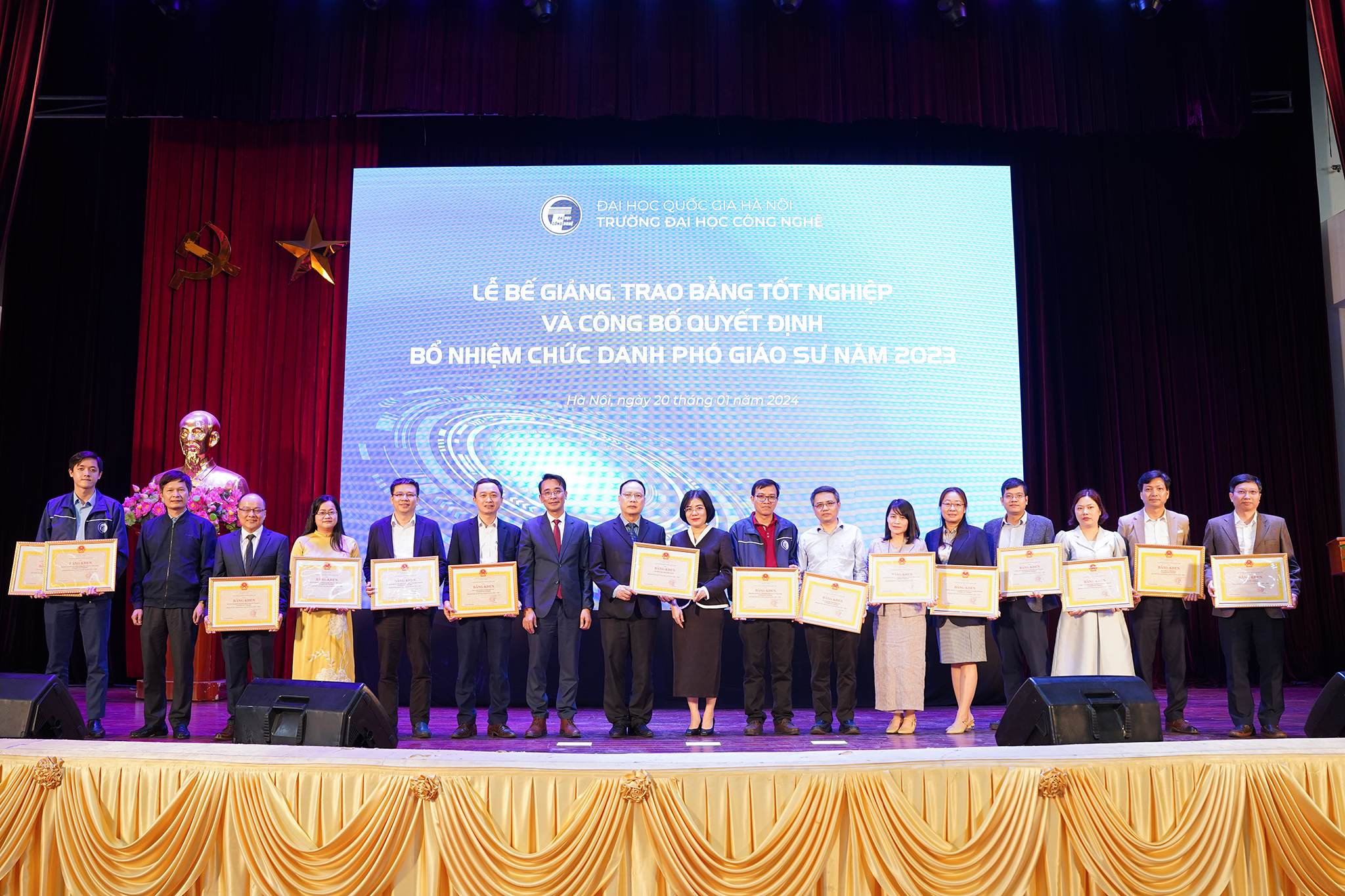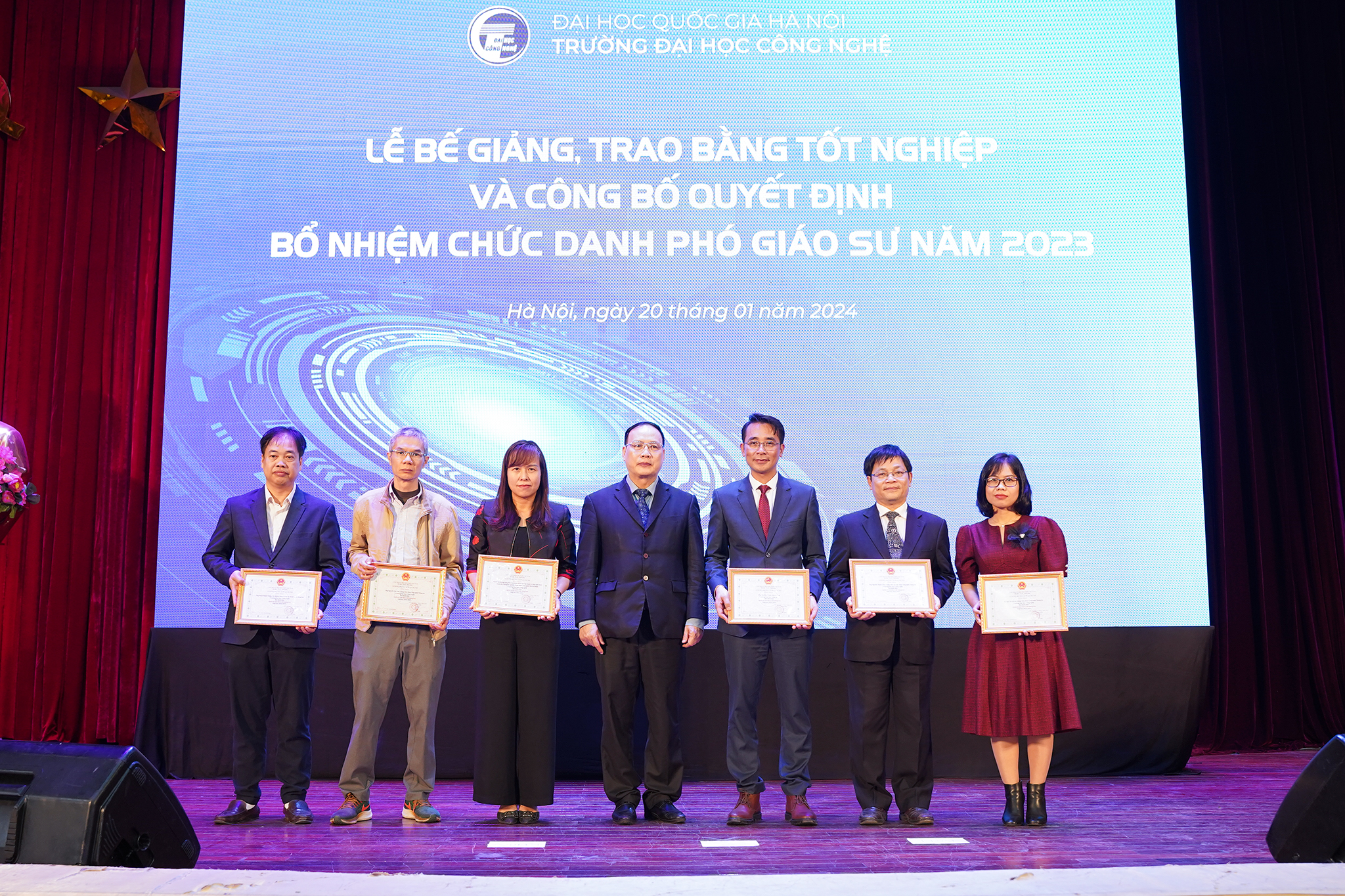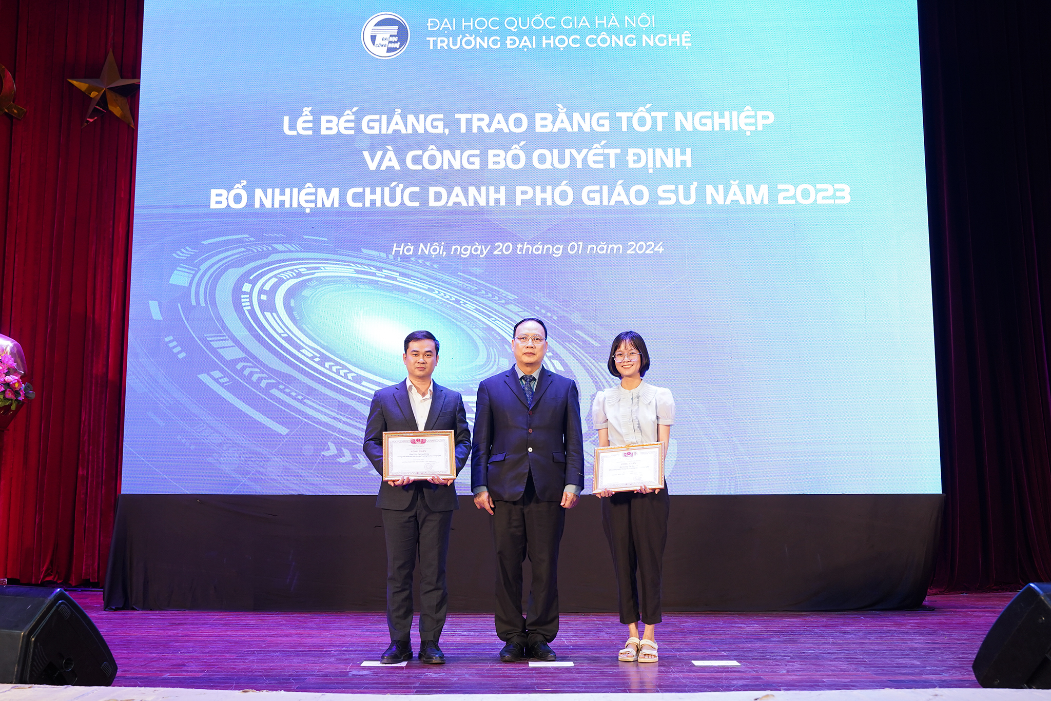 Ngày 20/1/2024, Trường Đại học Công nghệ – ĐHQGHN (UET-VNU) đã long trọng tổ chức Lễ bế giảng và trao bằng tốt nghiệp đợt 2 năm 2023 cho các tân Tiến sĩ, Thạc sĩ, Kỹ sư và Cử nhân, đồng thời công bố các Quyết định bổ nhiệm chức danh Phó Giáo sư năm 2023 tại Hội trường Nguyễn Văn Đạo – ĐHQGHN.