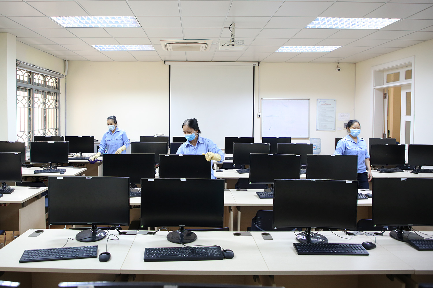 Sau khi tiến hành khử khuẩn, ngày 04/05/2021 Nhà trường chuyển sang làm việc theo hình thức giãn cách và đảm bảo 5K (Khẩu trang – Khử khuẩn – Khoảng cách – Không tập trung – Khai báo y tế) khi đến và làm việc tại trường.
