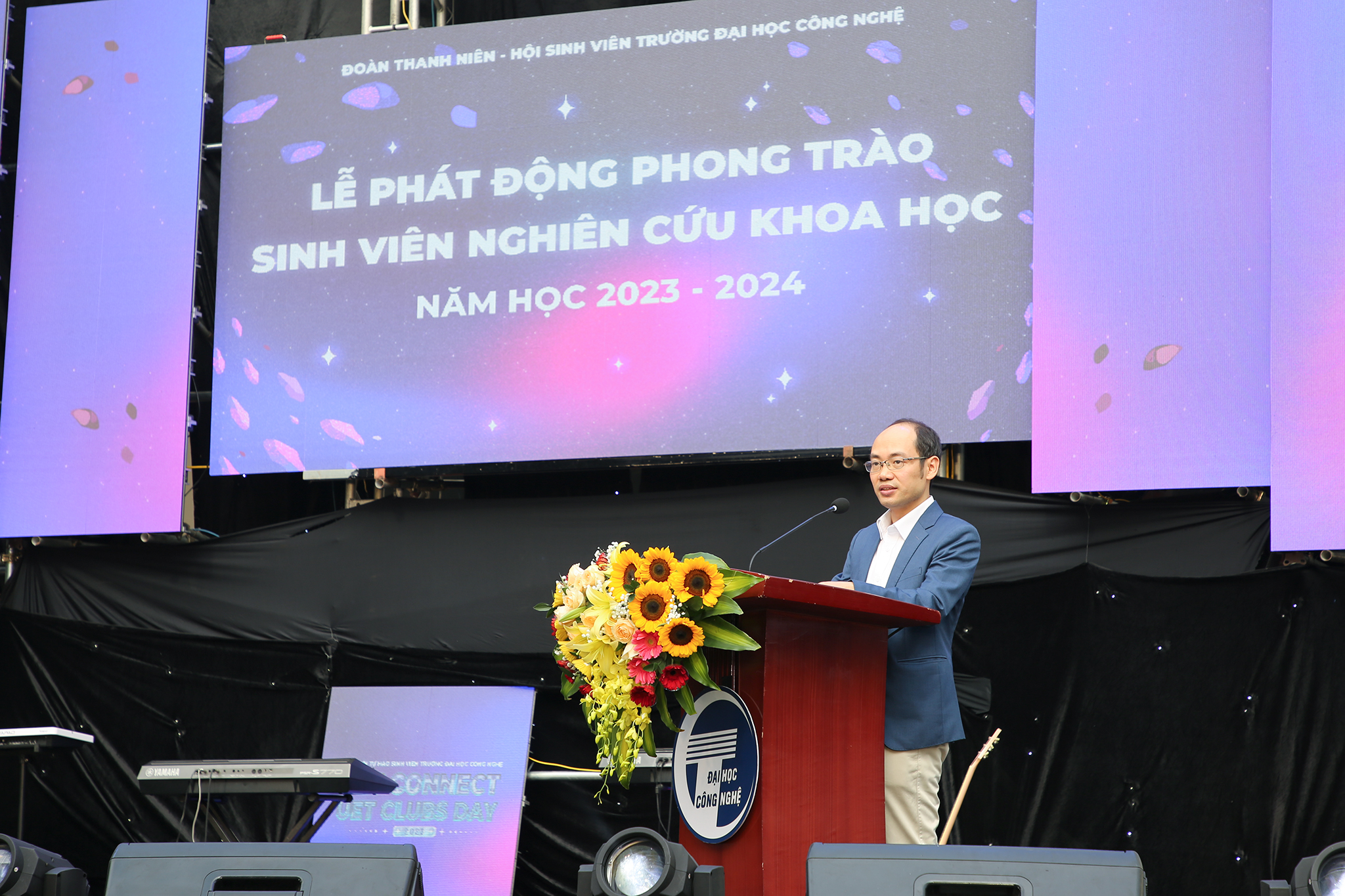 Tại chương trình, PGS.TS. Nguyễn Hoài Sơn – Trưởng phòng Khoa học công nghệ và hợp tác phát triển đã phát động phong trào sinh viên nghiên cứu khoa học năm học 2023 – 2024. Qua đó, PGS nhấn mạnh về tầm quan trọng của nghiên cứu khoa học trong thời đại cách mạng công nghiệp 4.0 và những thách thức về sự thay đổi cung – cầu lao động. Bên cạnh việc học tập kiến thức, sinh viên UET còn được xây dựng niềm đam mê học tập và nghiên cứu. Từ đó, sinh viên được tiếp cận kho tàng tri thức rộng lớn, rèn luyện kỹ năng học tập suốt đời. Hướng đến kỷ niệm 20 năm thành lập Trường, PGS tin tưởng với sự năng động, sáng tạo, nhiệt huyết của tuổi trẻ và sự say mê nghiên cứu của thầy cô, phong trào sinh viên nghiên cứu của Trường sẽ gặt hái được nhiều thành tích tốt.