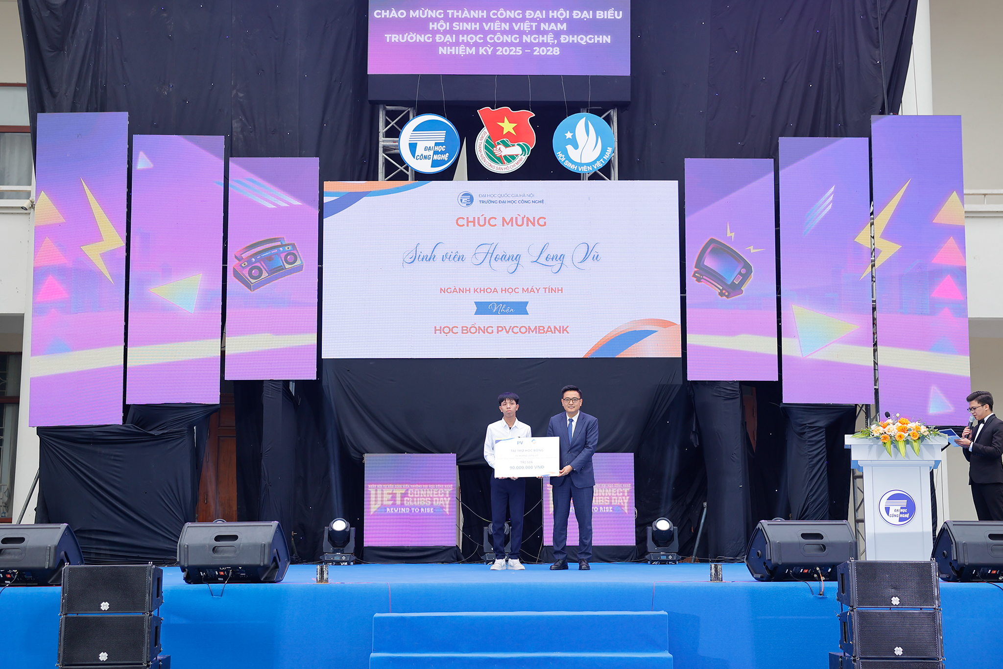Một dấu ấn nổi bật tại chương trình là Lễ trao học bổng PVcomBank trị giá 90 triệu đồng dành cho sinh viên Hoàng Long Vũ (QH-2024), ngành Khoa học Máy tính – nhằm hỗ trợ những sinh viên có hoàn cảnh khó khăn nhưng nỗ lực vươn lên. Đại diện PVcomBank, ông Phan Quang Chung – Giám đốc Khu vực miền Bắc nhấn mạnh, PVcomBank luôn chú trọng các hoạt động vì cộng đồng, đặc biệt trong lĩnh vực giáo dục – nơi nuôi dưỡng và phát triển nhân lực tương lai.