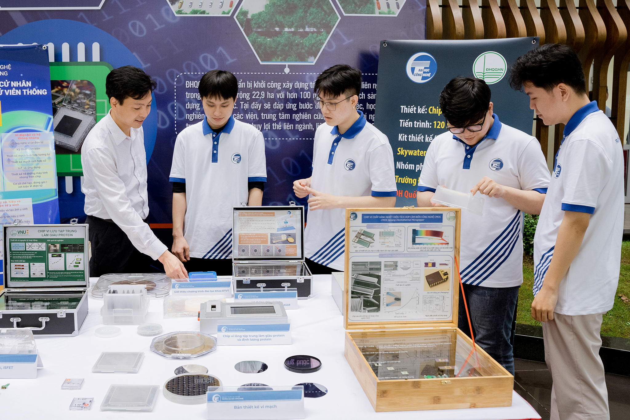 TS. Đinh Triều Dương giới thiệu các sản phẩm về chip bán dẫn với sinh viên trong khoa tại Triển lãm Công nghệ chip bán dẫn của ĐHQGHN năm 2023