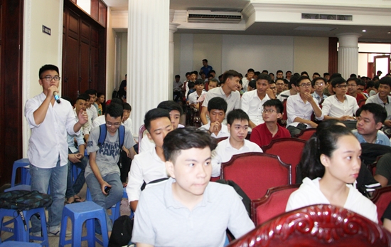 Phó Trưởng phòng Công tác sinh viên Bùi Trung Ninh (bên trái, ngoài cùng), Bí thư Đoàn Nguyễn Ngọc Linh (ở giữa) và Chủ tịch Hội sinh viên Nguyễn Đình Chinh (bên phải, ngoài cùng) giới thiệu, giải đáp các thắc mắc của sinh viên về quy chế và hoạt động của Nhà trường