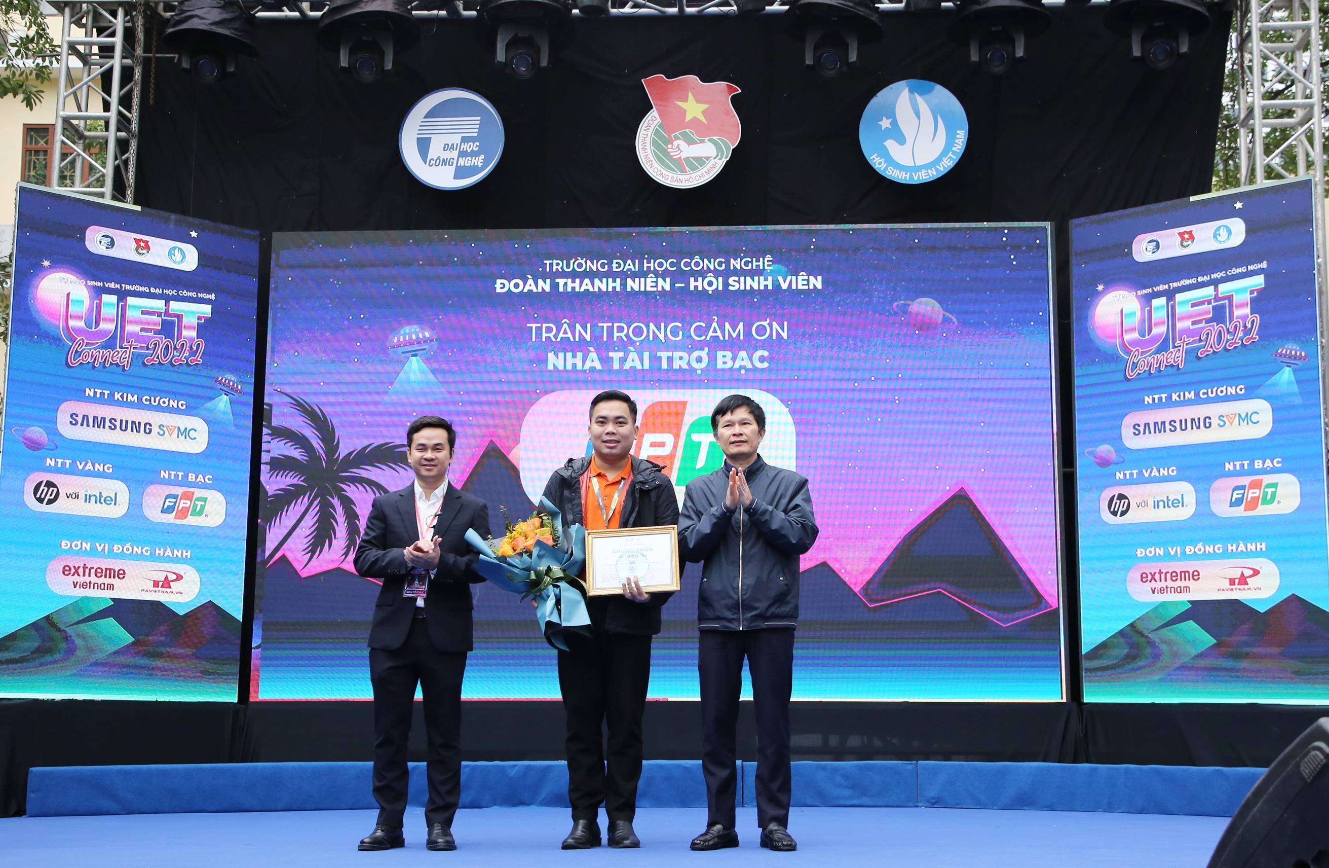TS. Nguyễn Anh Thái – Phó Hiệu trưởng Nhà trường (ngoài cùng, bên phải) và TS. Trần Cường Hưng – Bí thư Đoàn Thanh niên, Phó Giám đốc Trung tâm Đảm bảo chất lượng (ngoài cùng, bên trái) trao giấy chứng nhận cho ông Đào Việt Bách – Trưởng phòng Tuyển dụng và thu hút nhân tài FPT Software Academy