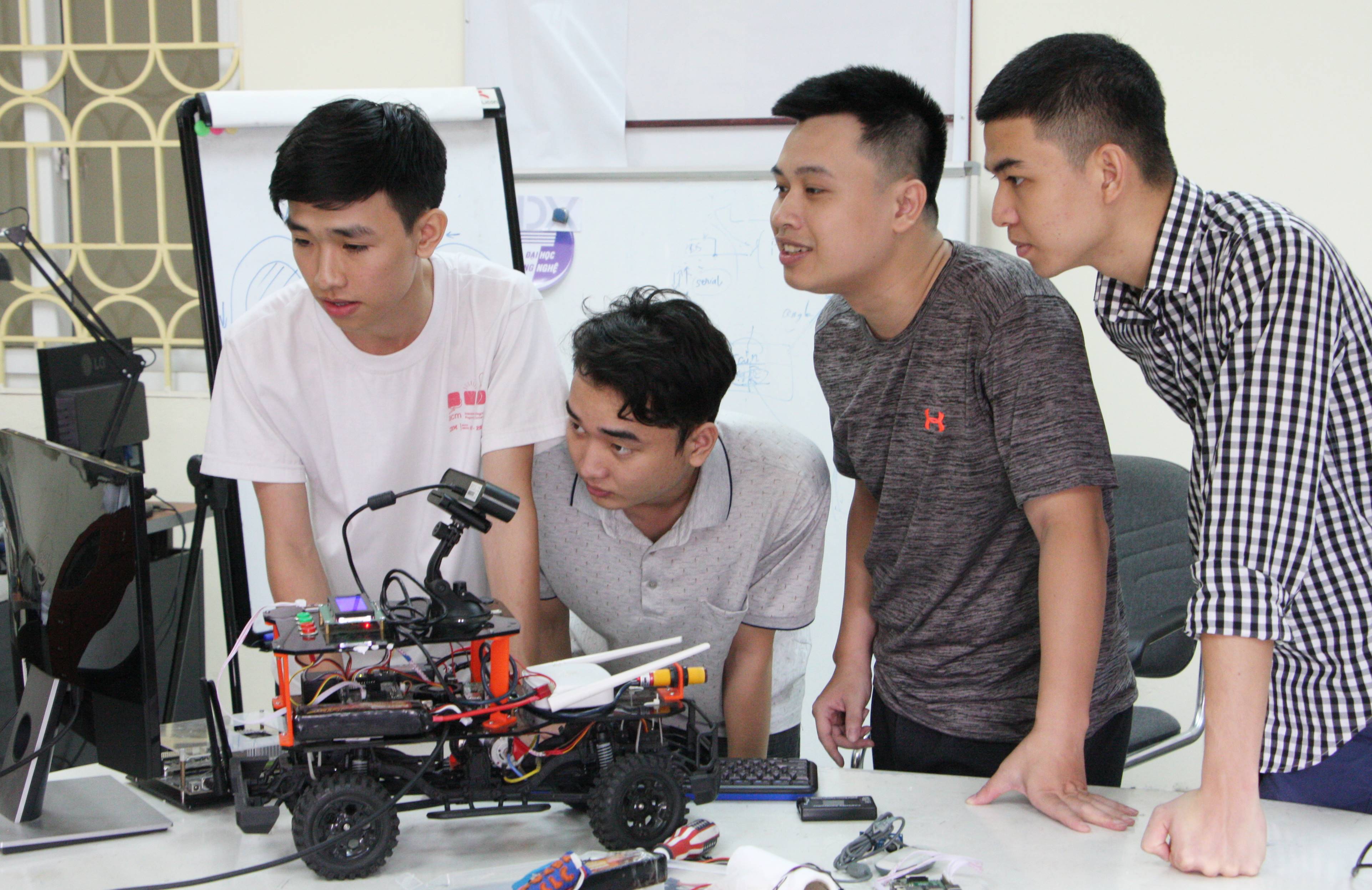ThS. Quách Công Hoàng (thứ hai, bên phải ảnh sang) đang hướng dẫn cho sinh viên thực hiện chế tạo xe tự hành