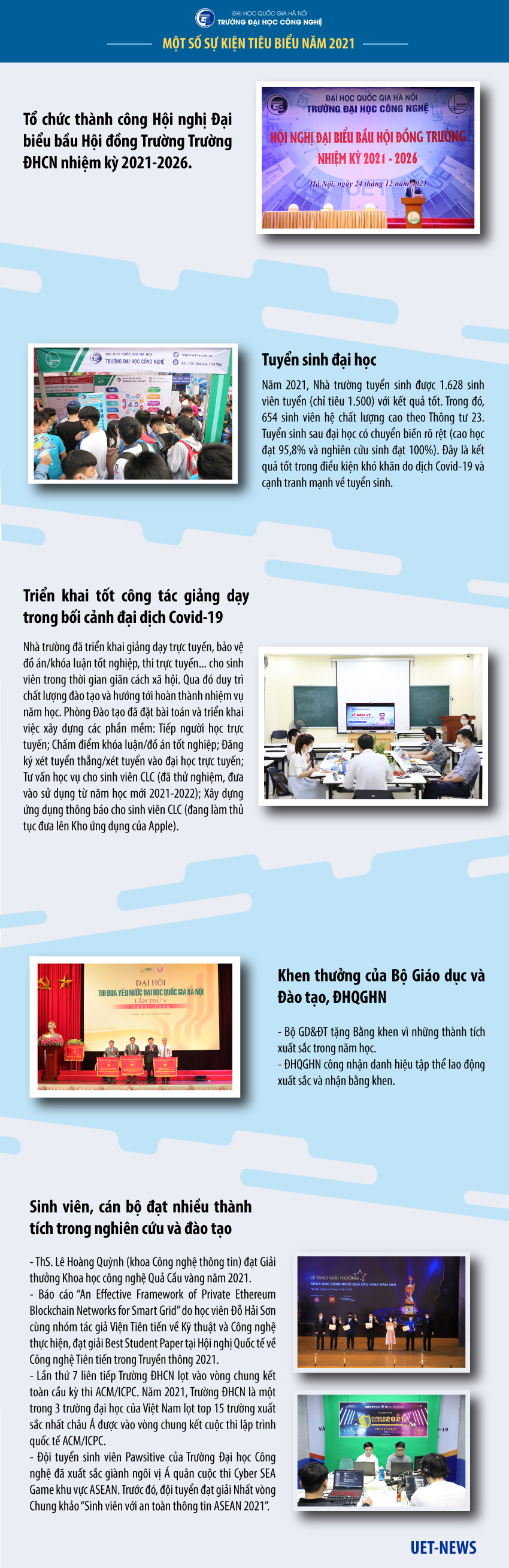 UET: Một số sự kiện tiêu biểu Năm 2021 Tiếp tục khẳng định vị thế và uy tín đối với xã hội, năm 2021 Nhà trường đã đạt được nhiều thành tích trong đào tạo, nghiên cứu, phát triển ứng dụng phục vụ cộng đồng… Bởi Tuyết Nga | 02/02/2022 | Tin Tổng Hợp | 3529 lượt xem | Tags: sự kiện