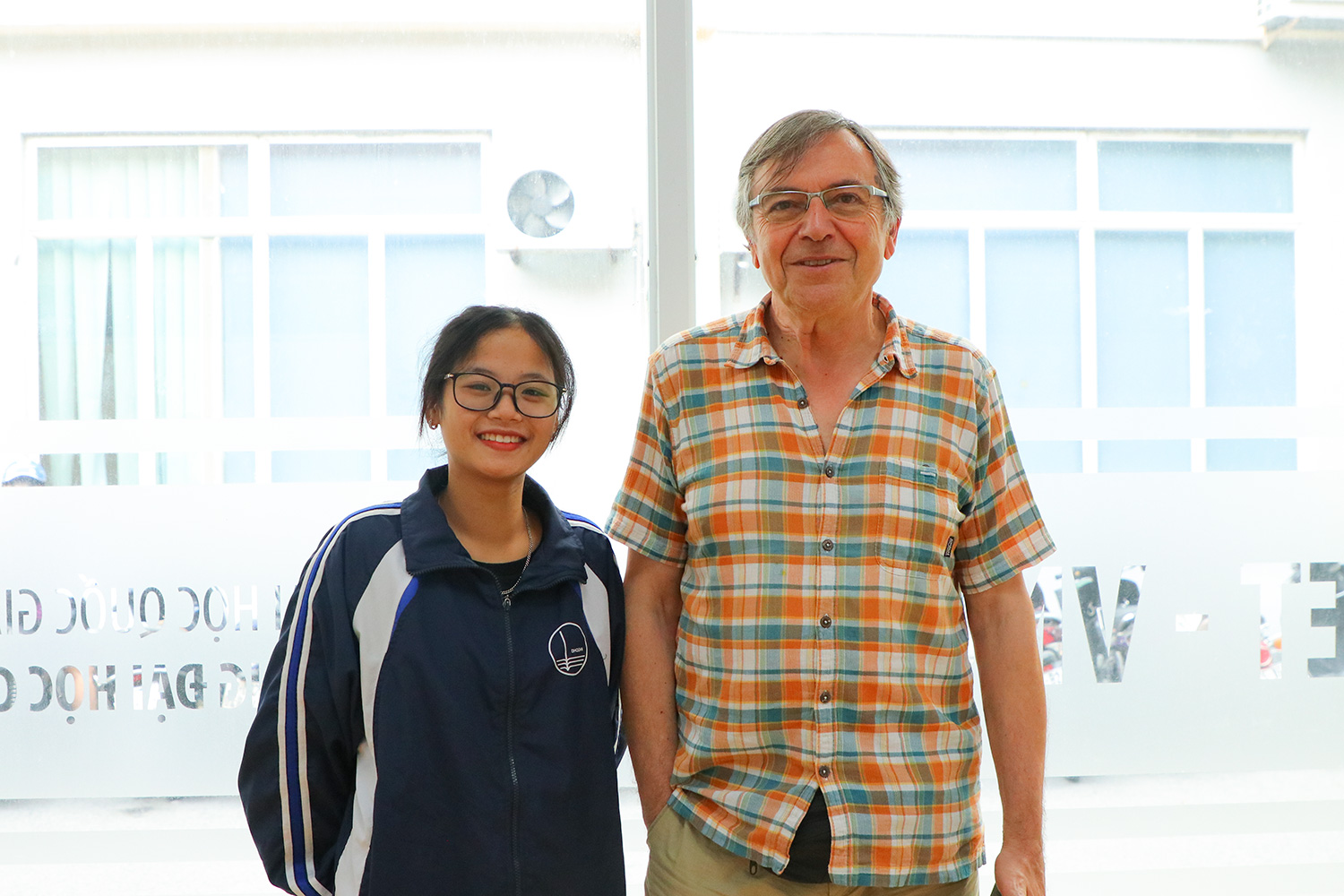 Sinh viên Đặng Thị Thu Uyên chụp ảnh kỷ niệm cùng GS.TSKH Pierre Duhamel