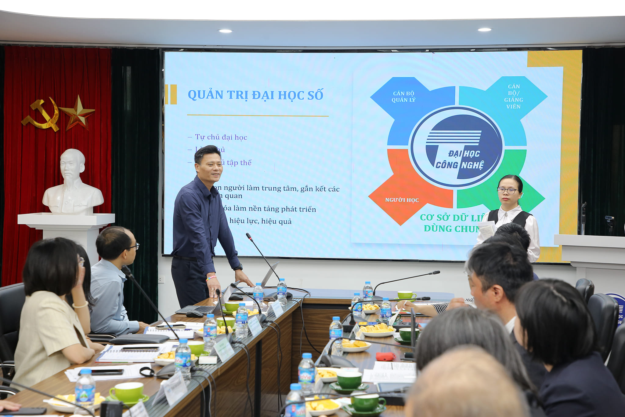 Trong phần trao đổi, đại diện hai trường đã thảo luận sâu về công tác đào tạo, tuyển sinh, quản lý và hỗ trợ sinh viên, đặc biệt là chuyển đổi số trong quản trị đại học. PGS.TS Trần Văn Quảng – Phó Trưởng phòng Đào tạo và ThS. Đỗ Hoàng Kiên – Giám đốc Trung tâm Đại học số chia sẻ về những bước tiến trong đổi mới chương trình đào tạo, nâng cao chất lượng đào tạo sau đại học, cũng như định hướng phát triển hệ thống quản trị đại học số tại UET.