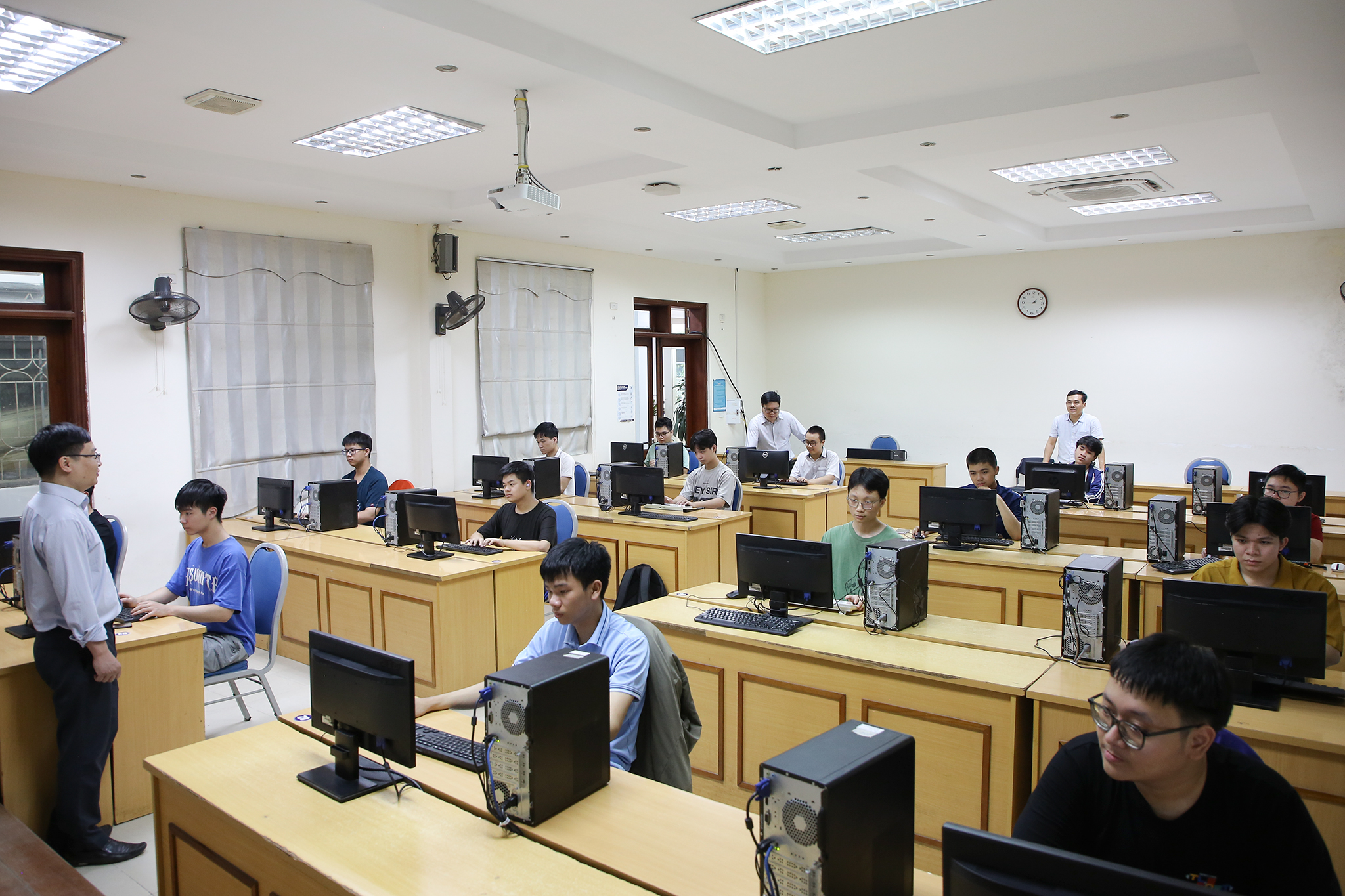 15 học sinh làm quen với hệ thống bằng việc thi thử tại phòng máy của Trường ĐH Công nghệ vào ngày 16/5/2024