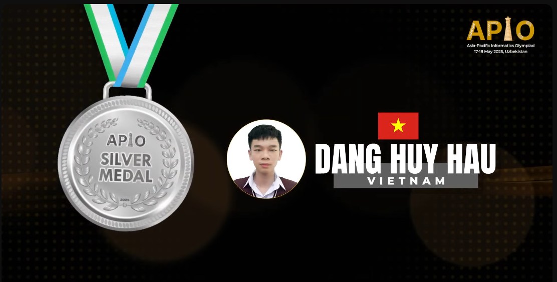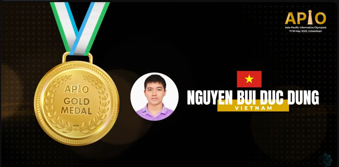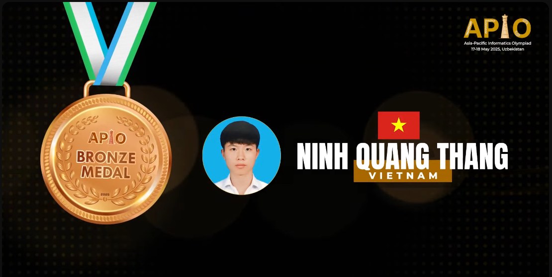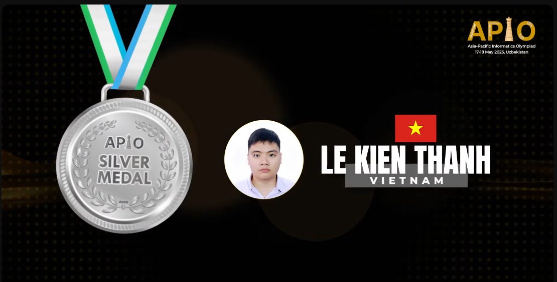 Bộ Giáo dục và Đào tạo (GD&ĐT) vừa thông tin về kết quả chính thức của Đội tuyển quốc gia Việt Nam dự thi Olympic Tin học châu Á – Thái Bình Dương (APIO) năm 2025 do Uzbekistan đăng cai tổ chức. Theo đó, 06 học sinh Việt Nam tham gia xét giải thưởng giành huy chương gồm 1 Huy chương Vàng, 02 Huy chương Bạc và 03 Huy chương Đồng. Với thành tích này, đoàn Việt Nam đứng thứ 5 trên bảng xếp hạng huy chương.