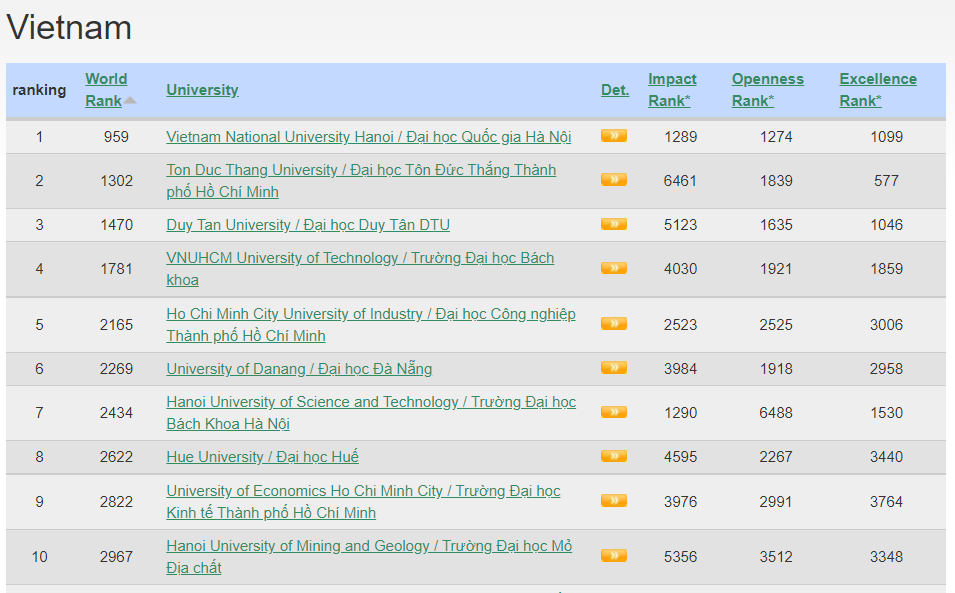 Top 10 cơ sở giáo dục đại học của Việt Nam trong bảng xếp hạng Webometrics tháng 7/2021 (Nguồn: https://www.webometrics.info/en/Asia/Vietnam)